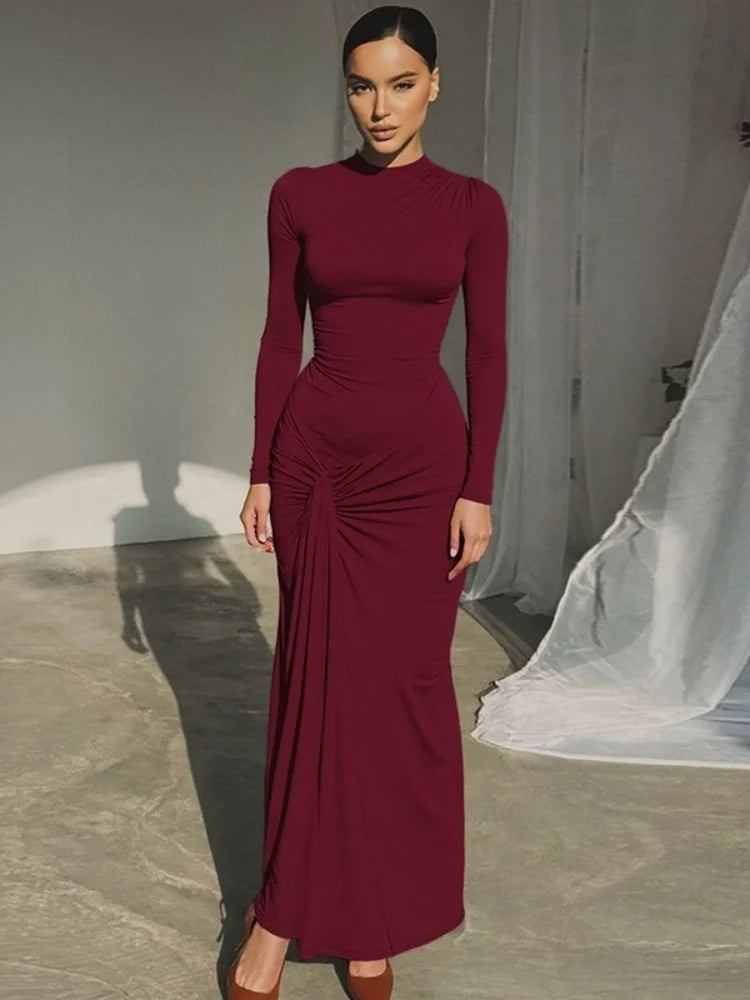 Long Sleeve Ruched Maxi Dress Solid Color Elegant Dresses for Woman Party Outfits Autumn 2025