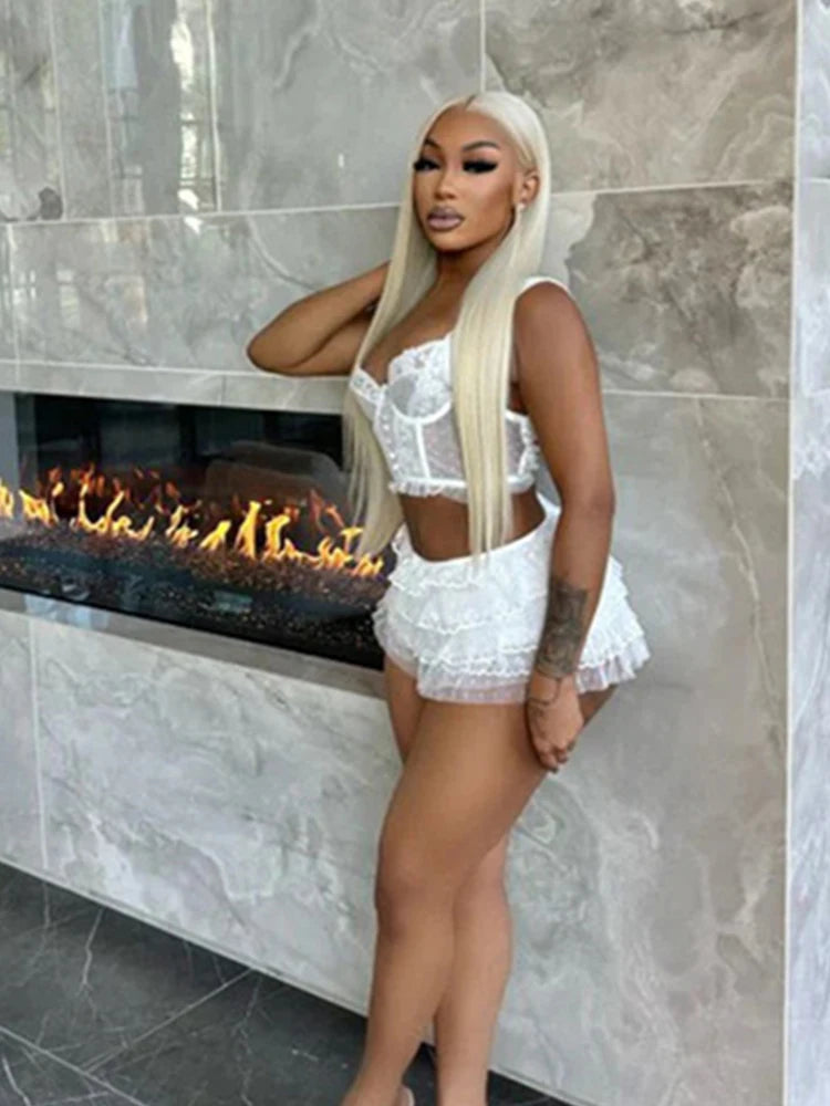 Mesh Patchwork 2 Piece Set Women Low-Neck Sexy Backless Crop Tops+Ruched Tierred Skirts Midnight Club Party Outfits