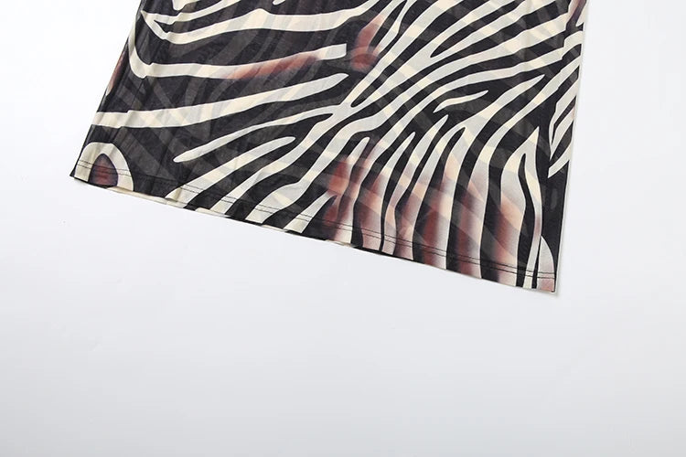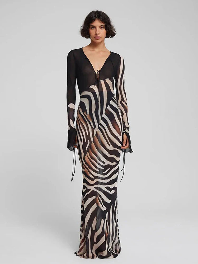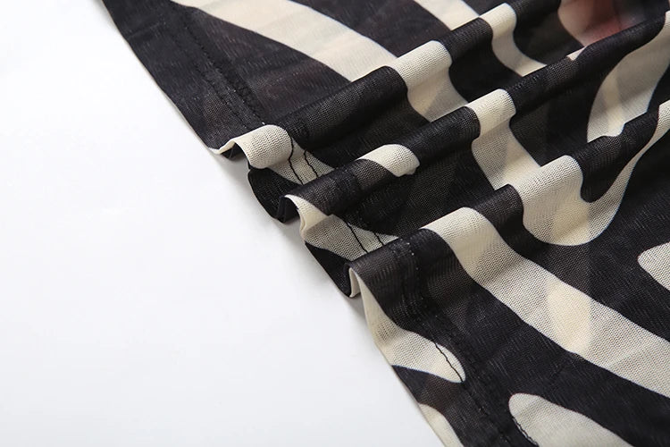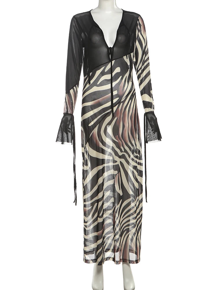 Mesh Patchwork Dress Women Fashion Print Low-Neck Sexy Cleavage Shirring Flared Sleeve Street Wild Style Long Bodycon