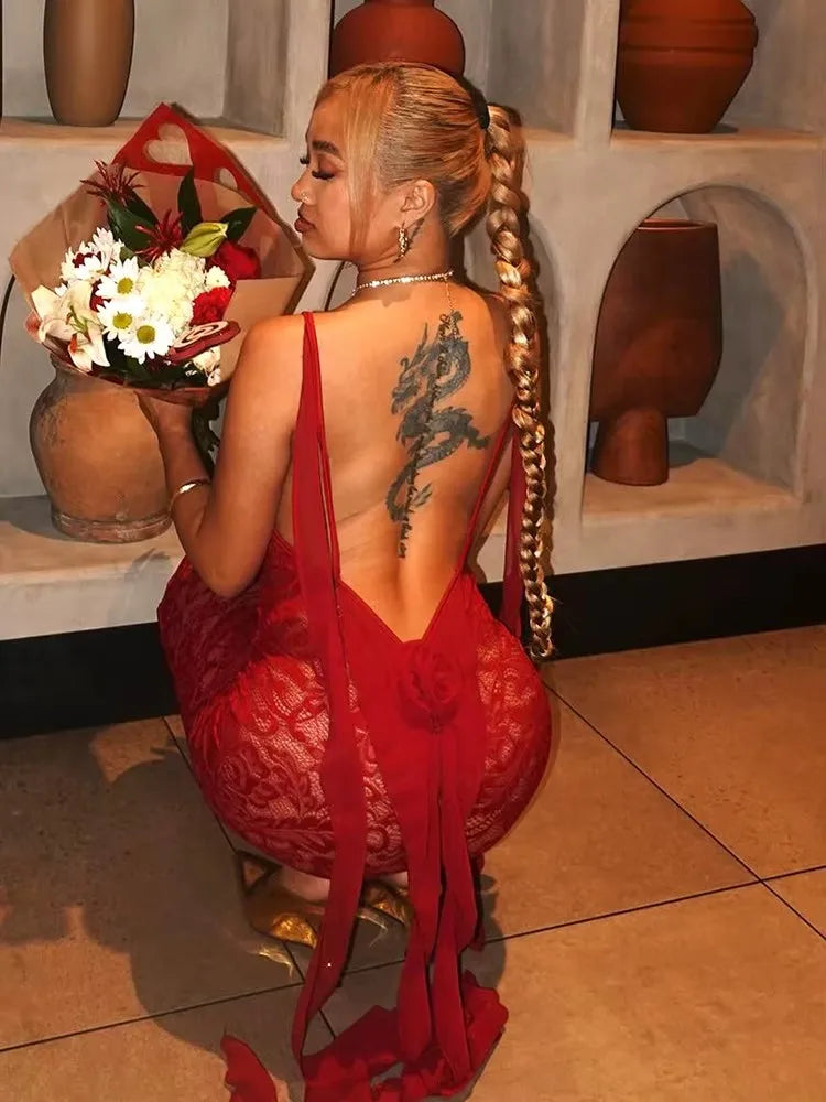 Mesh Patchwork Dress Women Sexy Jacquard Backless Sleeveless Long Ribbon Midnight Hipster Coquett Club Party Outfits
