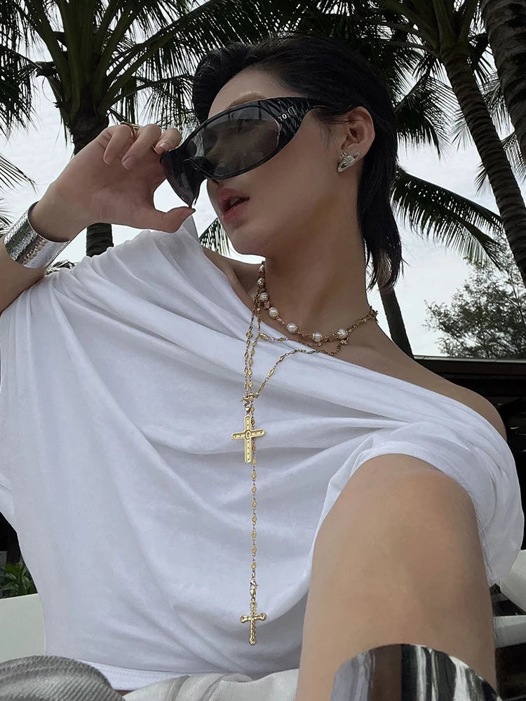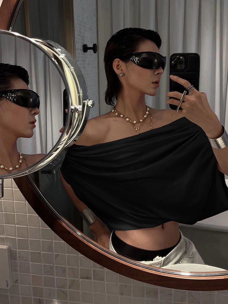One Shoulder Crop Tops Women Folds Skinny Loose Summer Korean Style Simple Classic Casual Street Daily Harajuku Tops