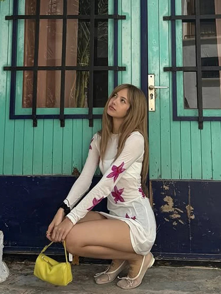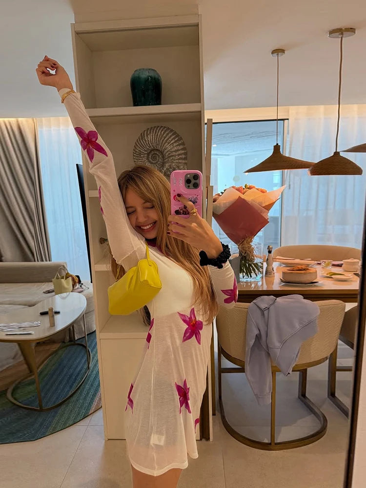 Orchid Print Dress Women See Through Full Sleeve o-Neck Skinny Autumn Simple Streetwear o-Neck Daily Basic Bodycon