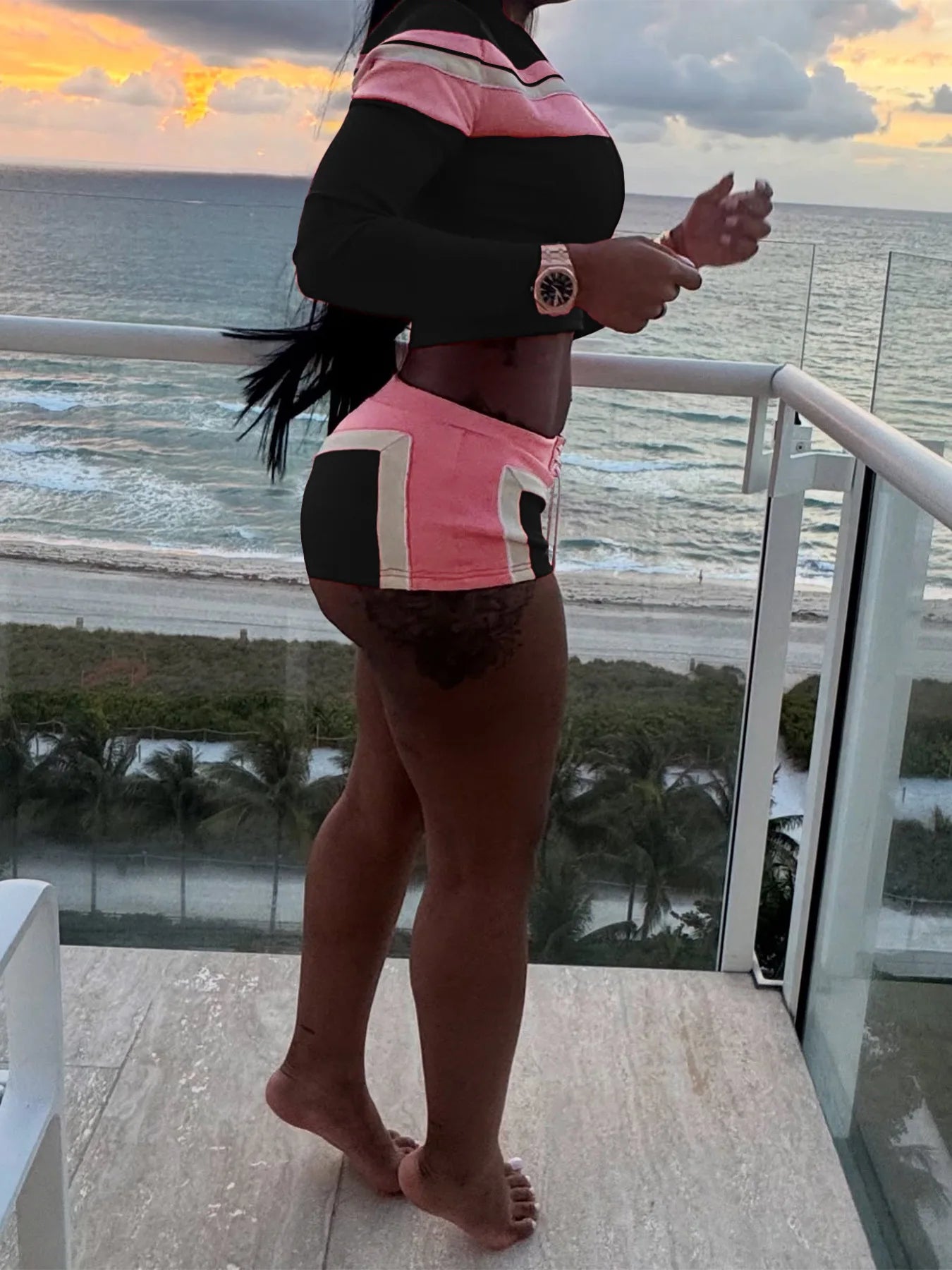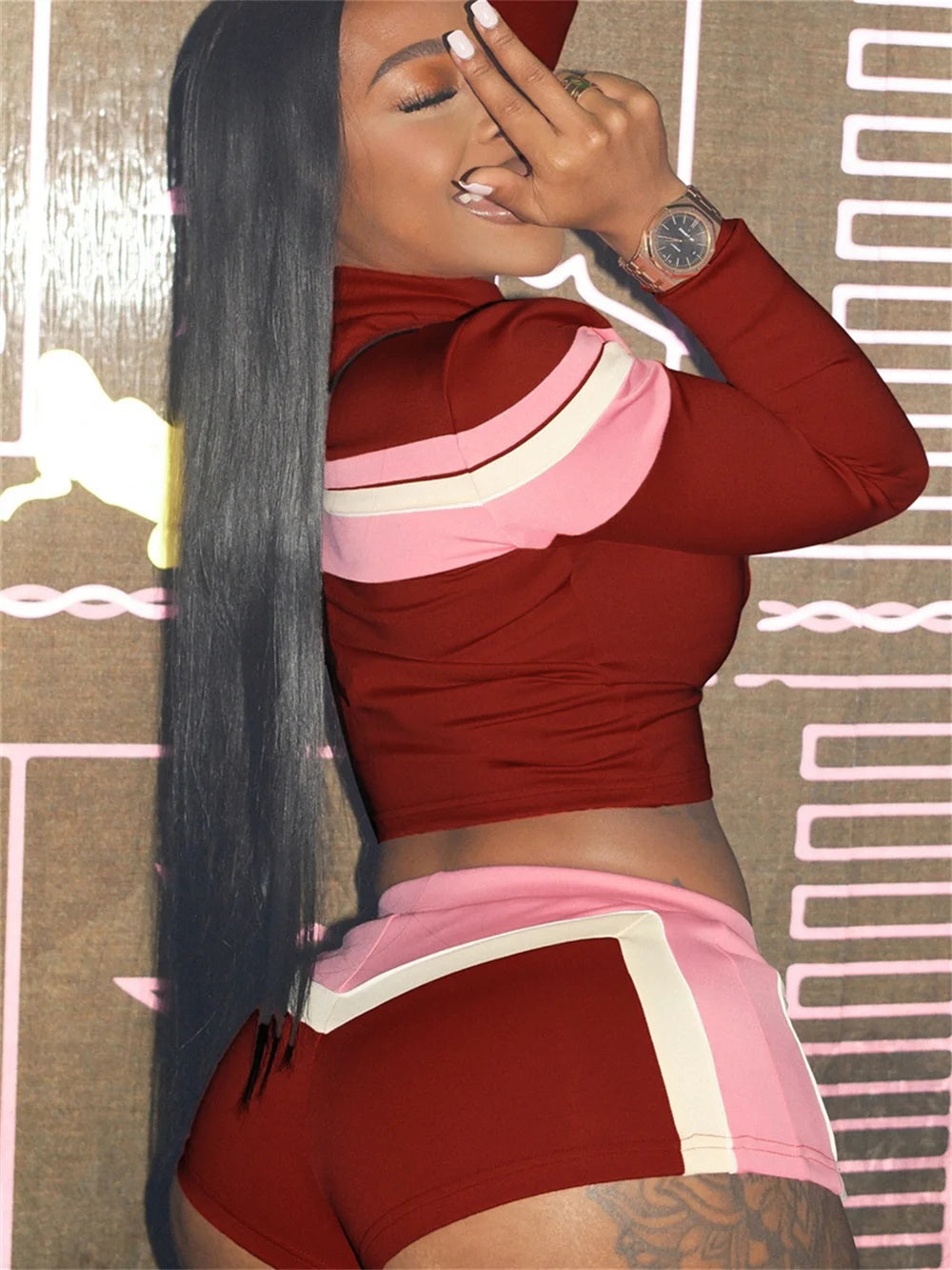Patchwork 3 Piece Set Women Zip Crop Tops+Bra+Shirring Mini Shorts Matching Casual Streetwear Stretch Slim Tracksuit