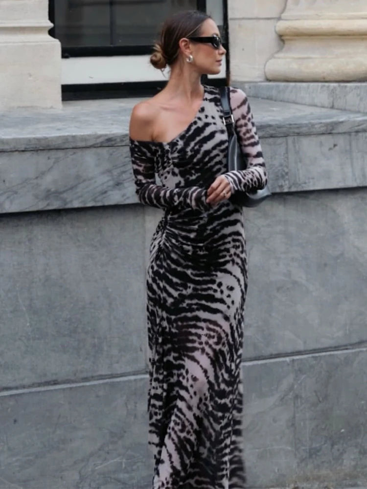 Patchwork Design Long Dress Women Autumn Trend Inclined Shoulder Full Sleeve Skinny Stretch Wild Style Streetwear
