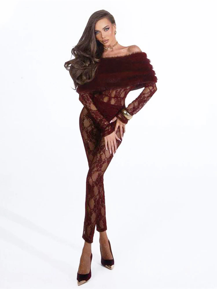 Patchwork Faux Fur Collar Jumpsuits Women See Through Skinny Sexy Midnight Coquett Fashion Street Wild Classic Outfit