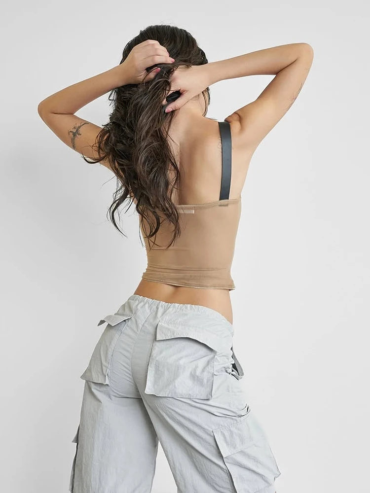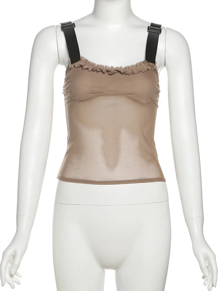 Patchwork Fungus Edge Camisole Women Y2K Mesh Metal Adjustment Clasp Low-Neck Sexy Skinny Midnight Summer Trend Tops