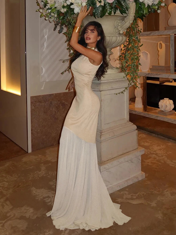 Patchwork Mesh Maxi Dress Women o-Neck Sleeveless Folds Skinny Elegant Banquet Fashion Vacation Classic Chic Vestidos