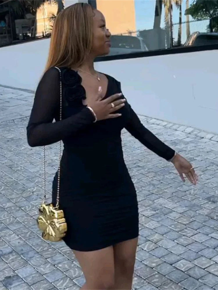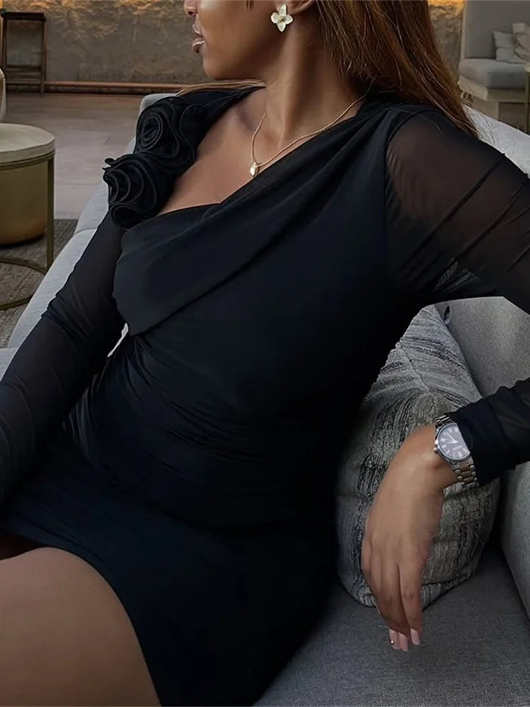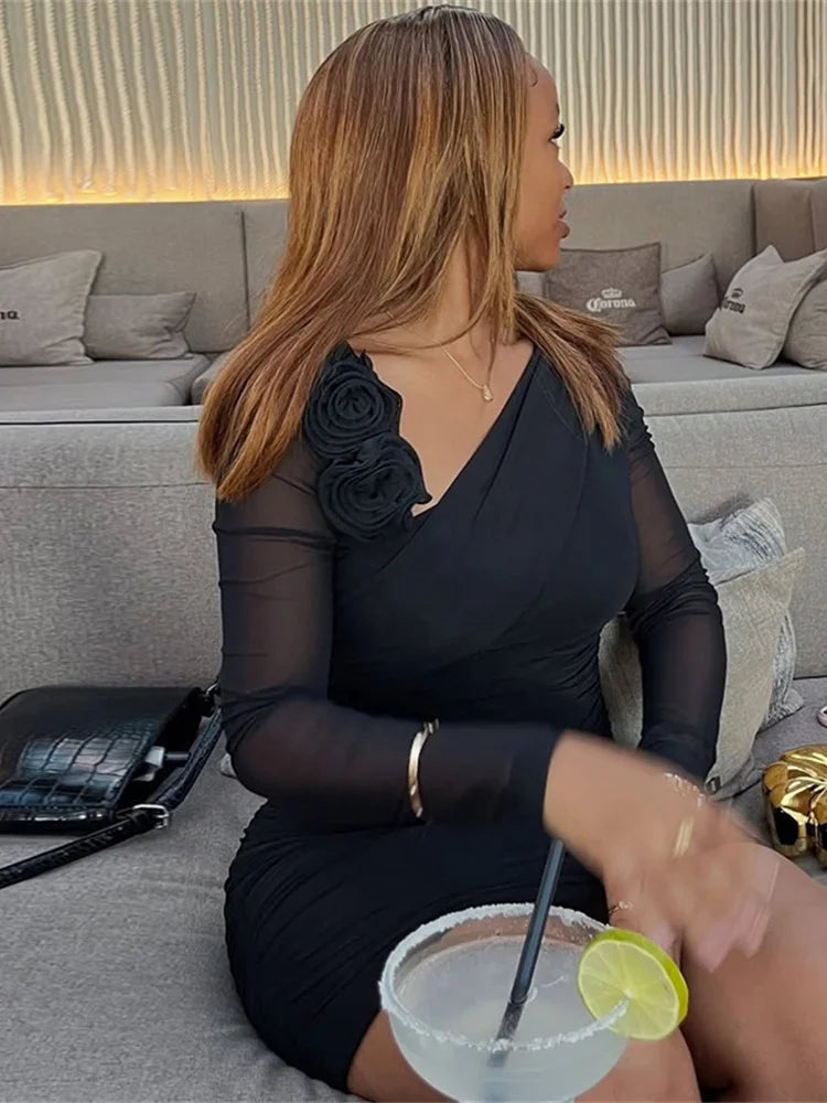 Patchwork Mesh Sexy Dress Women 3D Flowers Folds Slanted Collar Elastic Midnight Autumn Trend Party Clubwear Bodycon