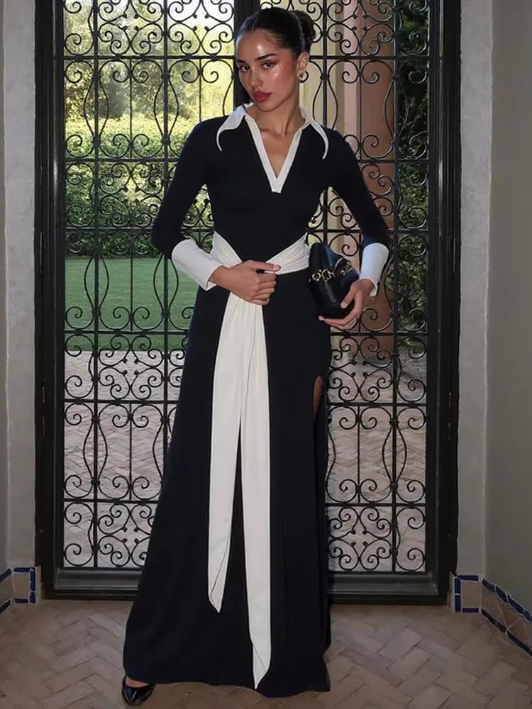 Patchwork V-Neck Dress Women Chic Full Sleeve Ribbon Knot Side Split Stretch Basic Streetwear Elegant Casual Bodycon