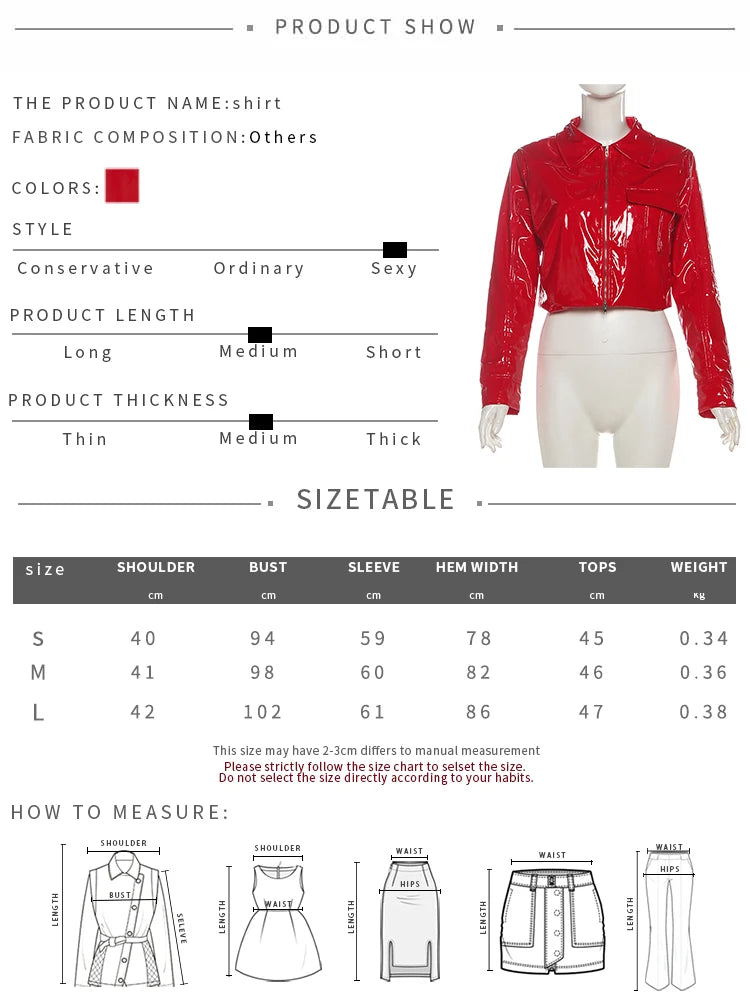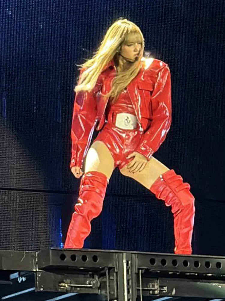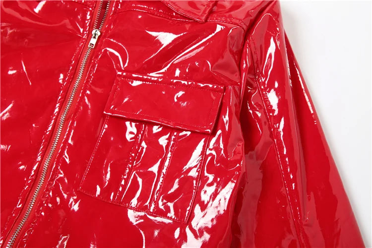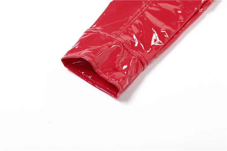 Patent Leather 2-Piece Set Women Zipper Jacket+Short Sleeve Slim Bodysuit Hip Hop Style Fashion Sexy Midnight Hottie Suit