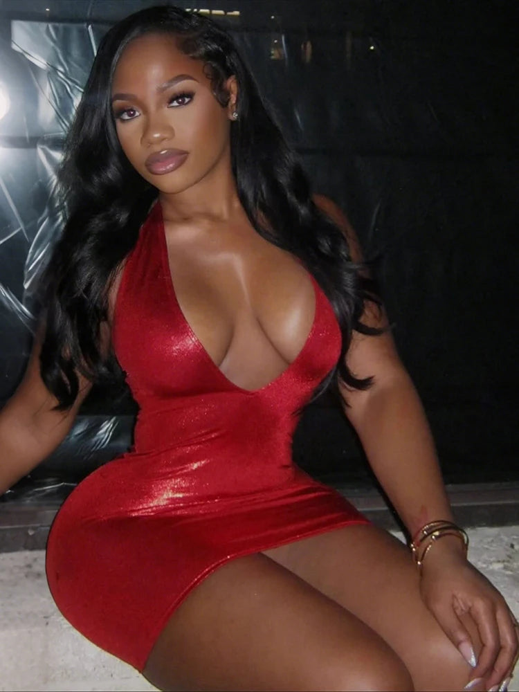 Peach Hip Sexy Backless Mini Dress Woman Halter Low-Neck Cleavage Sleeveless Skinny Midnight Club Party Hipster Bodycon