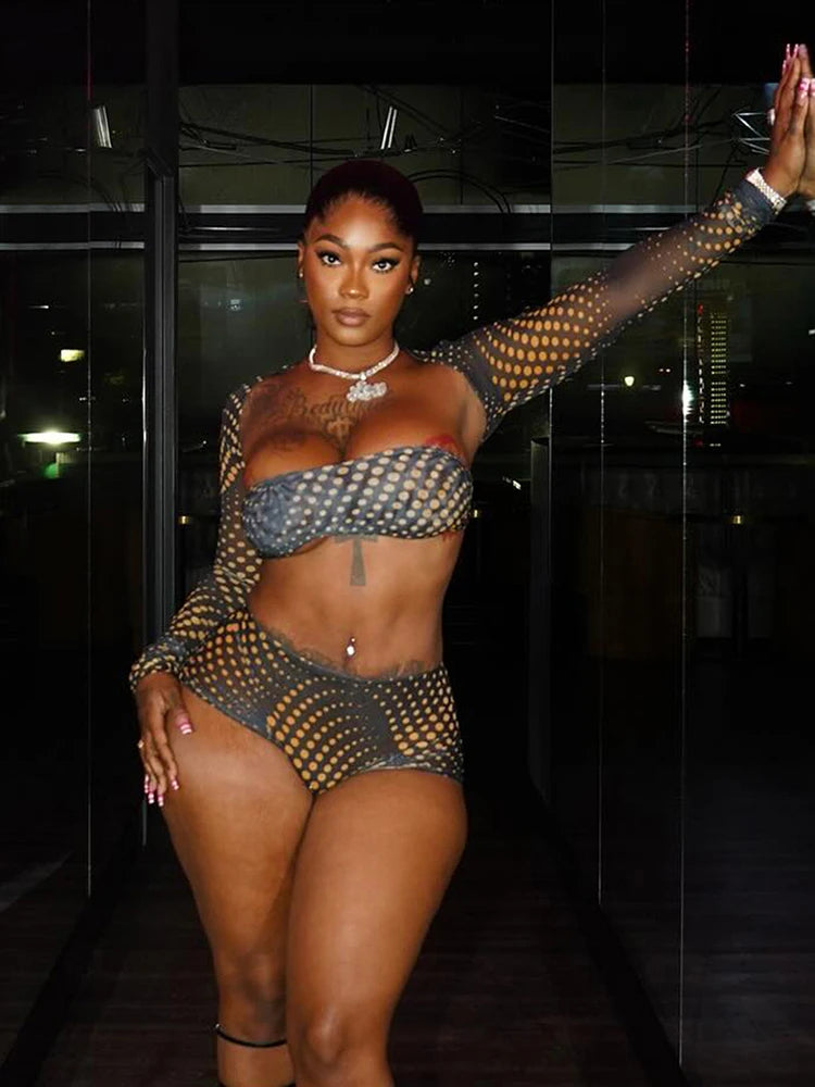 Polka Print 3 Piece Set Women Full Sleeve Shawl+Mini Strapless Tops+Skinny Shorts Hottie Midnight Sexy Fashion Suits