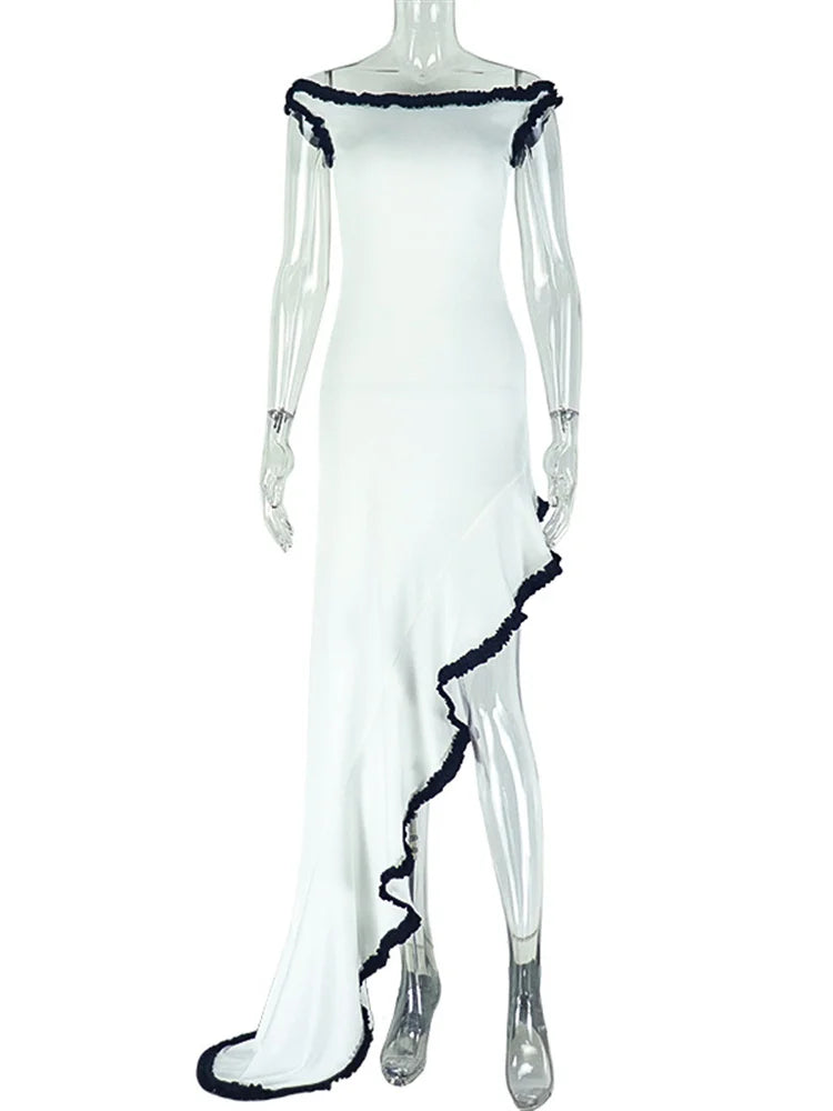 Ruched Elegant Dress Women Patchwork Slash Neck Backless Sleeveless Ruffles Asymmetry Hem Prom Party Long Bodycon