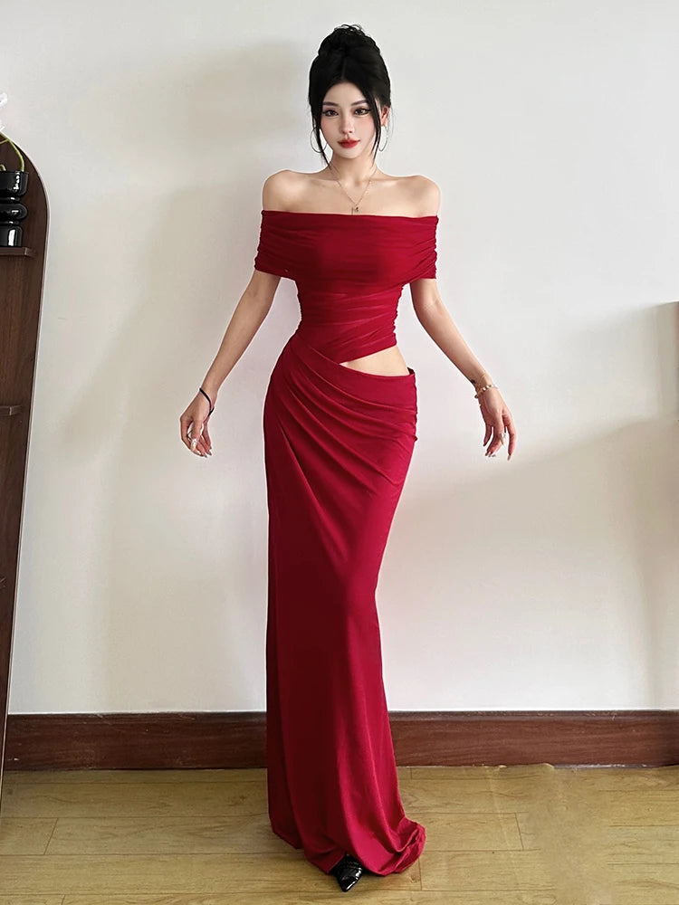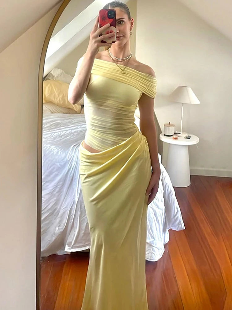 Ruched Irregular Dress Women Mesh Patchwork Slash Neck Short Sleeve Skinny Stretch Trend Elegant Long Bodycon Outfits