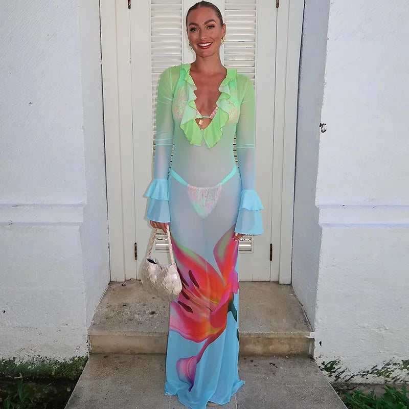 See Through Floral Gradient Mesh Dress Sexy Beach Vacation Outfits Ruffled Flare Sleeve Long Flowy Dresses