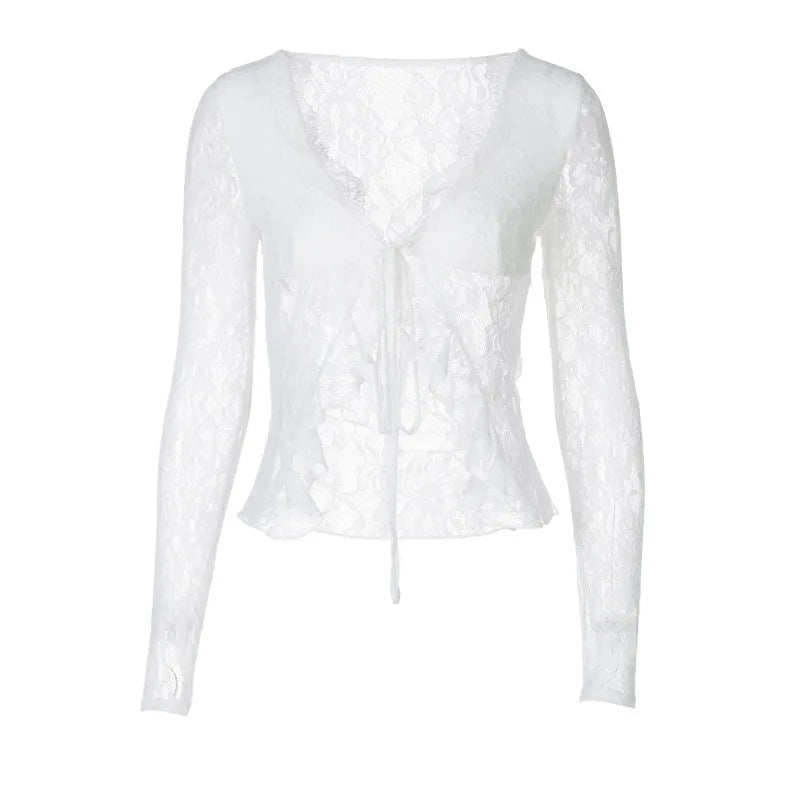 See Through Lace White Shirts & Blouses Tie Front V-neck Cardigan Long Sleeve Top Sexy Woman Clothes