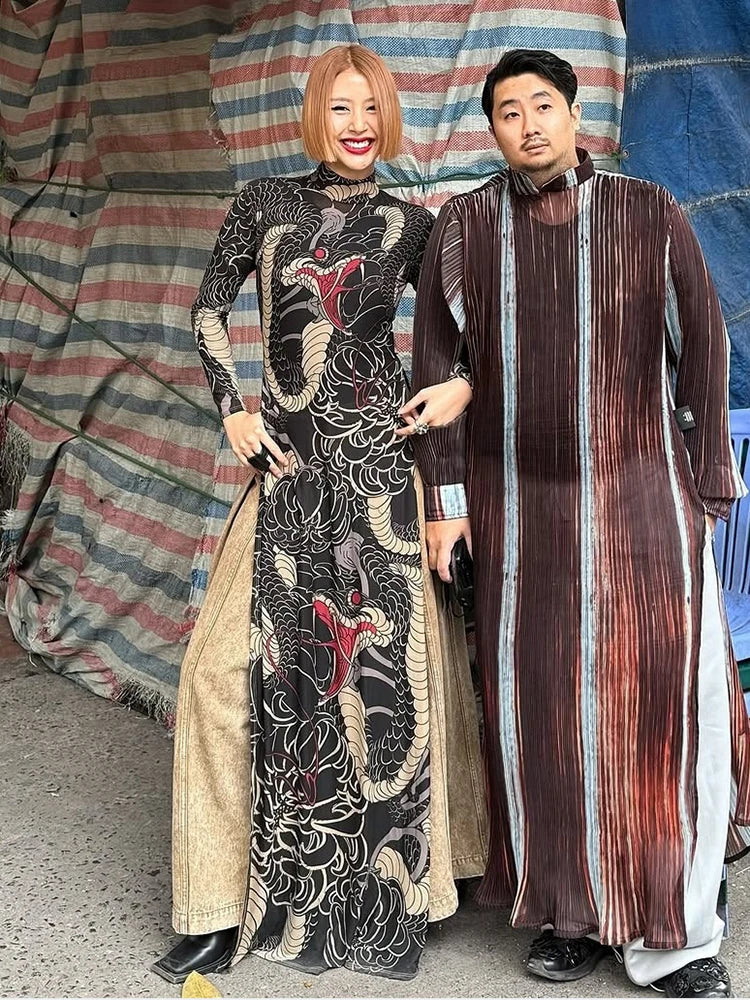 See Through Long T-Shirts Women Snake Print Turtleneck Long Sleeve High Split Elastic Sexy Coquette Skinny Club Tops