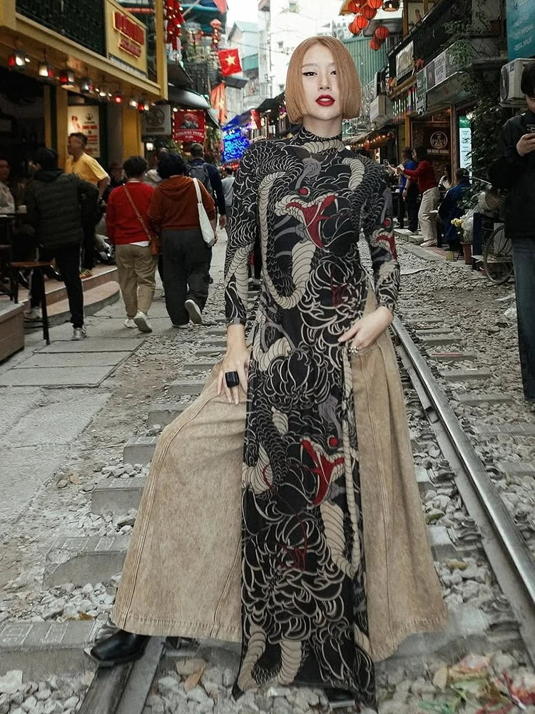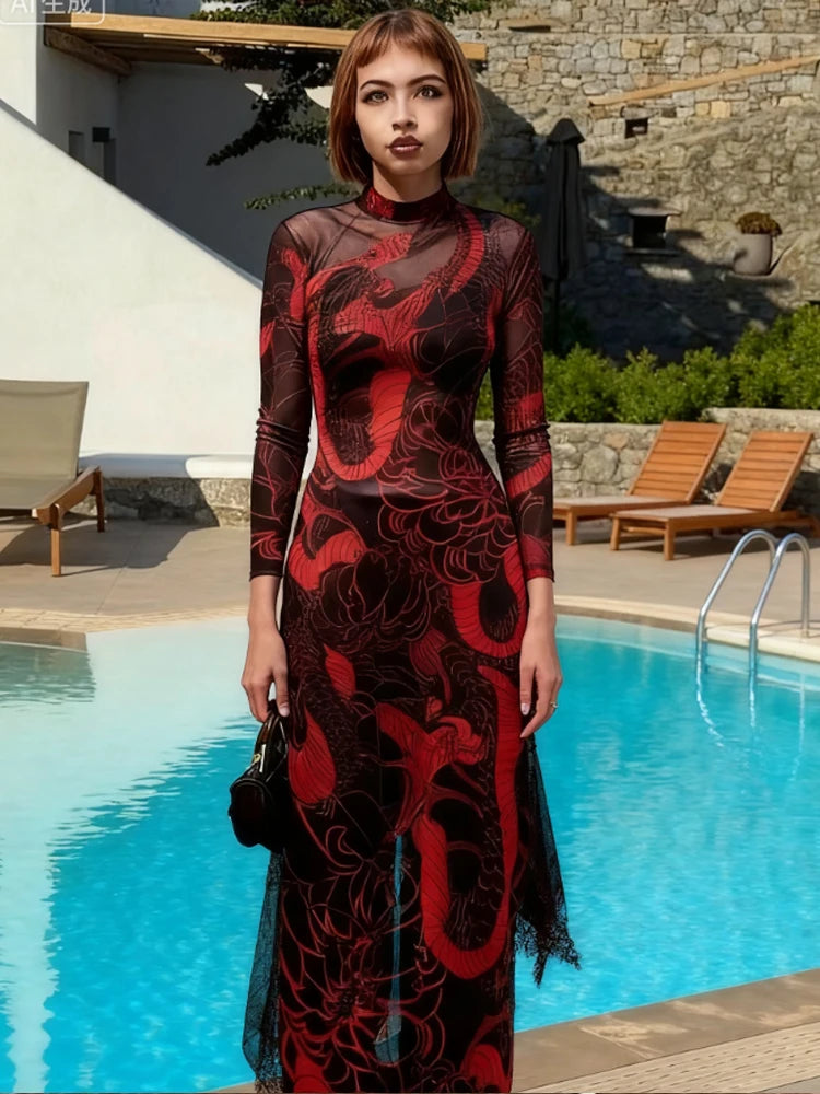 See Through Maxi T-Shirts Women Snake Print Turtleneck Full Sleeve High Split Elastic Sexy Coquette Skinny Clubwear