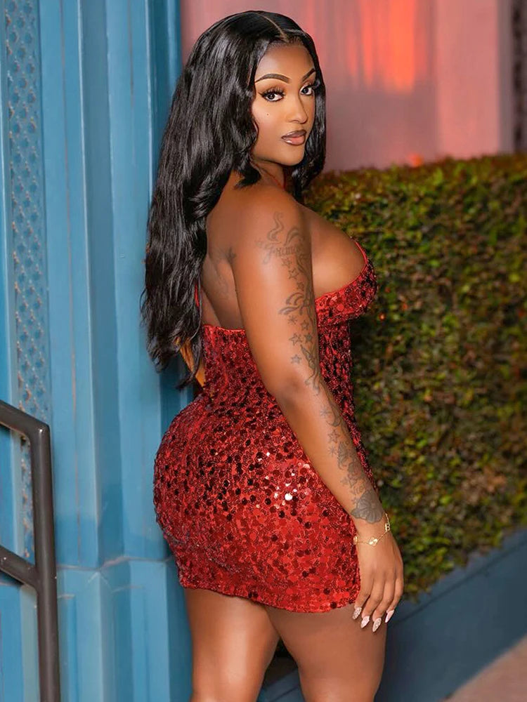 Sequins Halter Glitter Dress Women Y2K Sexy Low-Neck Sleeveless Bandage Coquette Midnight Party Club Skinny Bodycon