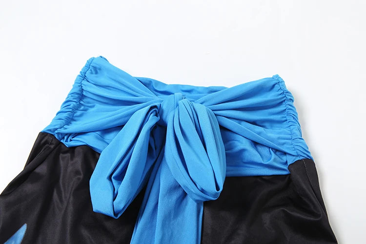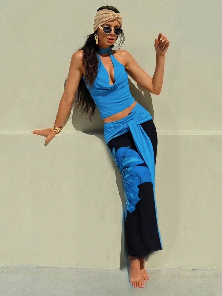 Sexy 2-Piece Set Women Halter Swing Collar Backless Tank Tops+Print Patchwork Tassels Folds Skirt Chic Vacation Suit