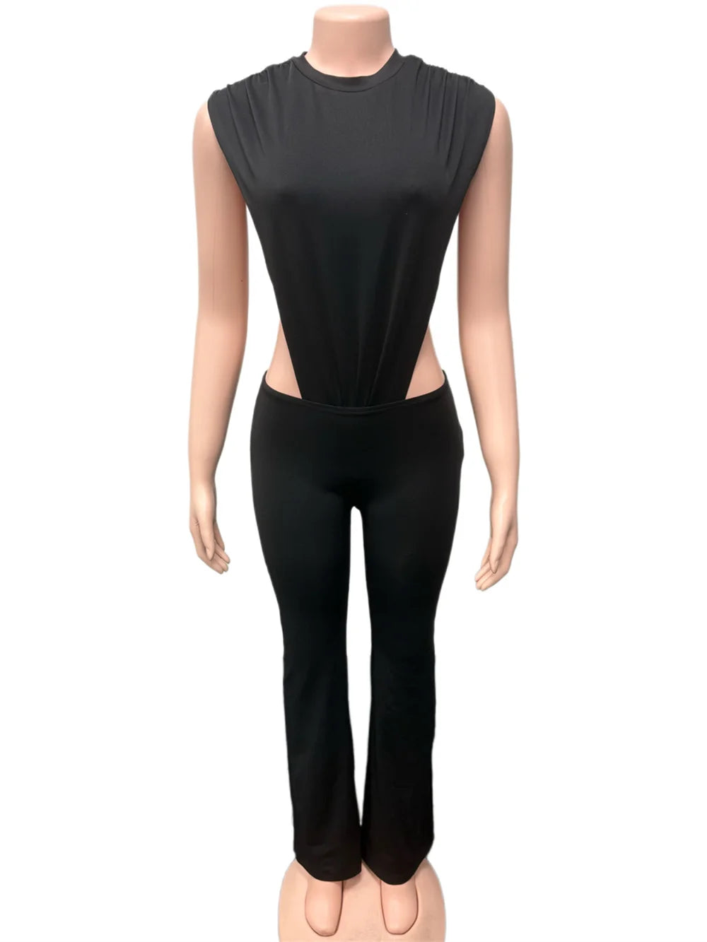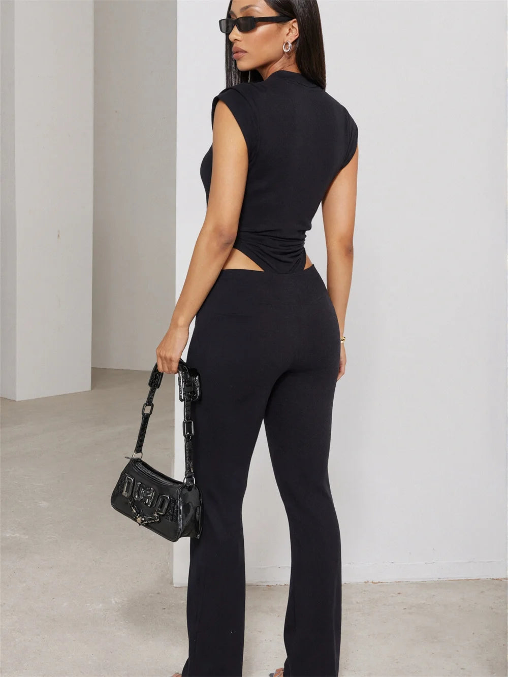 Sexy 2Piece Set Women Tracksuit Sleeveless O-Neck Side Split Bodysuit+Flare Pants Stretch Midnight Matching Clubwear