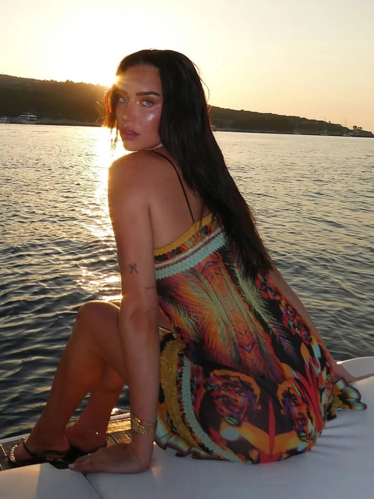 Sexy Beach Camis Dress Women Colorful Print Sleeveless Skinny Vacation Midnight Party Clubwear Scalloped Hem Bodycon