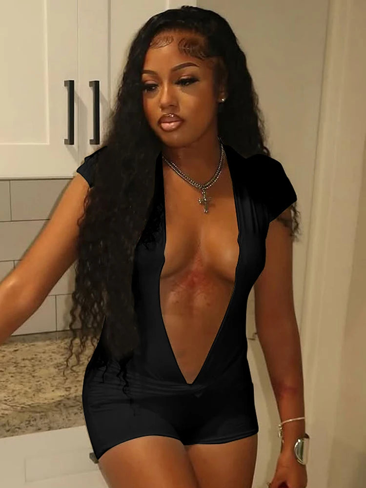 Sexy Coquette Romper Women Shorts Sleeve Deep V-Neck Patchwork Knot Ruched Sash Midnight Club Skinny Street Playsuits