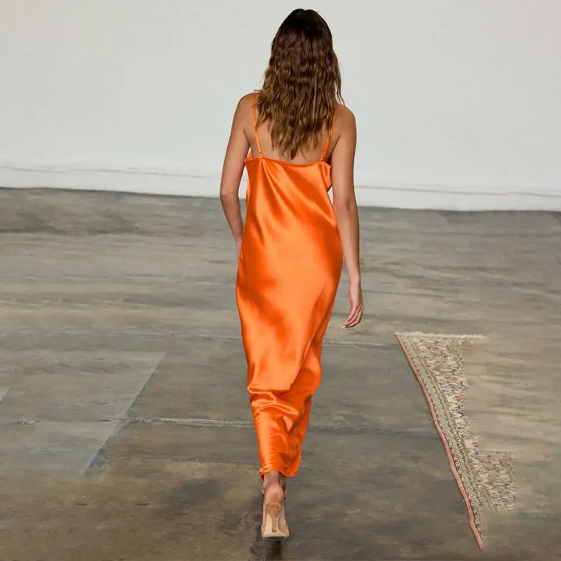 Sexy Deep V Neck Backless Long Dresses Green French Style Satin Dress Elegant Clothes Woman