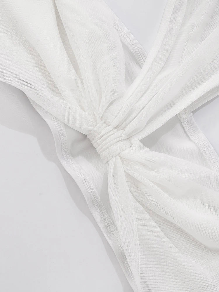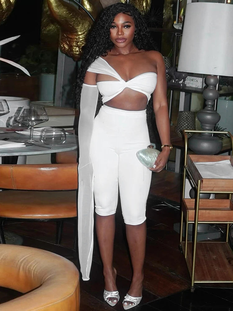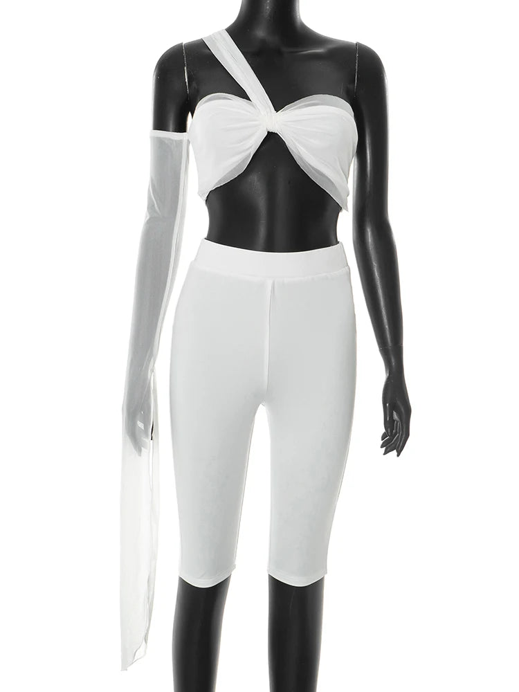 Sexy Fashion 2 Piece Set Women Mesh Patchwork Single Sleeve Strapless Top+Skinny Shorts Hottie Street Hipster Outfits