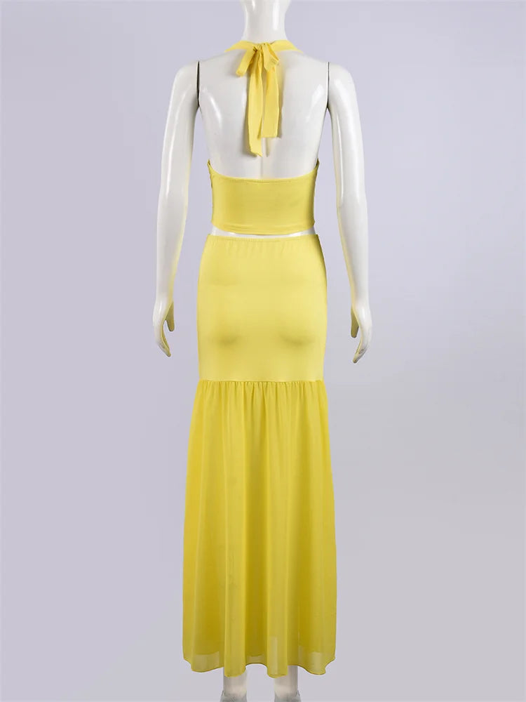 Sexy Fashion 2 Piece Set Women Metal Flower Decoration Halter Hollow Tops+Mesh Patchwork Long Skirts Elegant Outfits