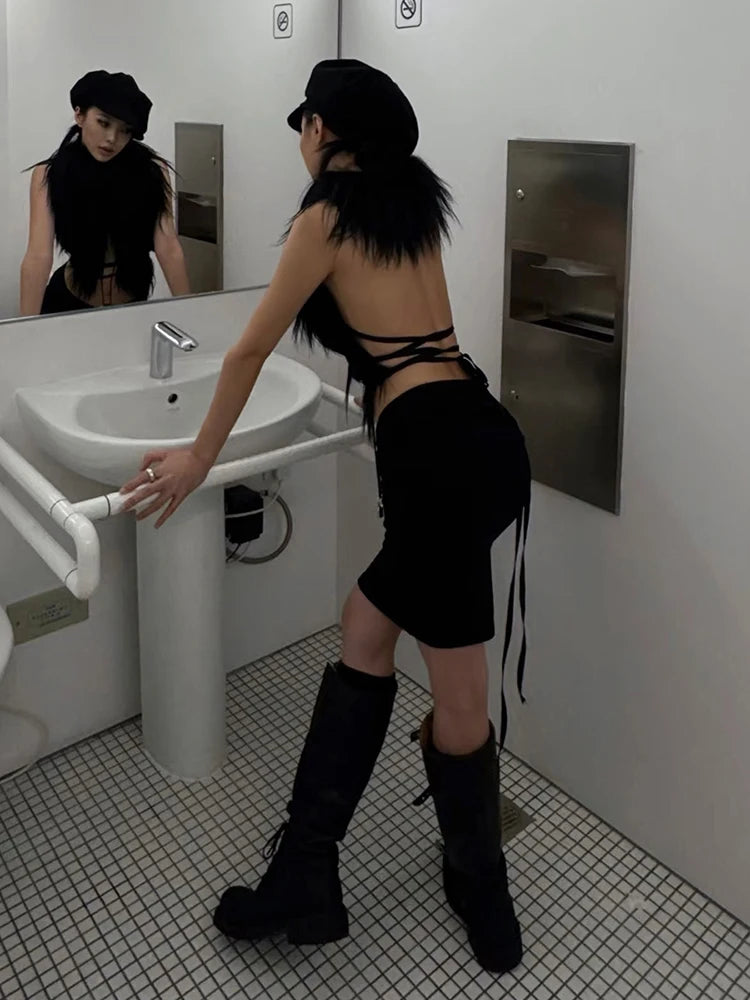 Sexy Furry Halter Top Women Fur Collar Backless Lace-Up Hottie Coquette Dark Punk Style Music Festival Clubwear Vest