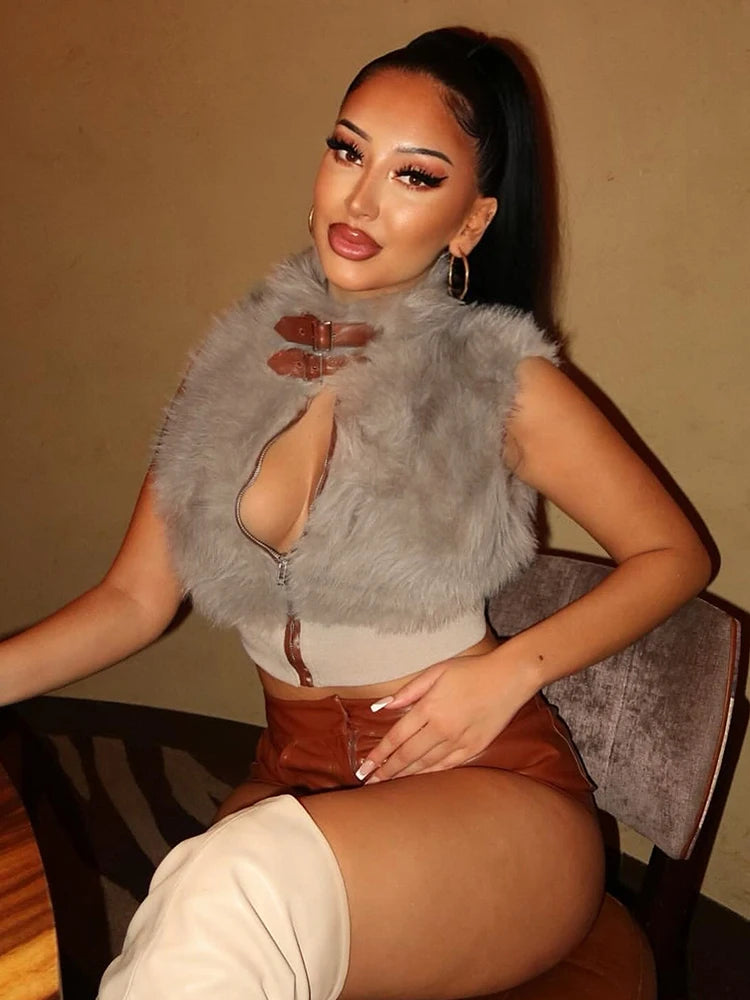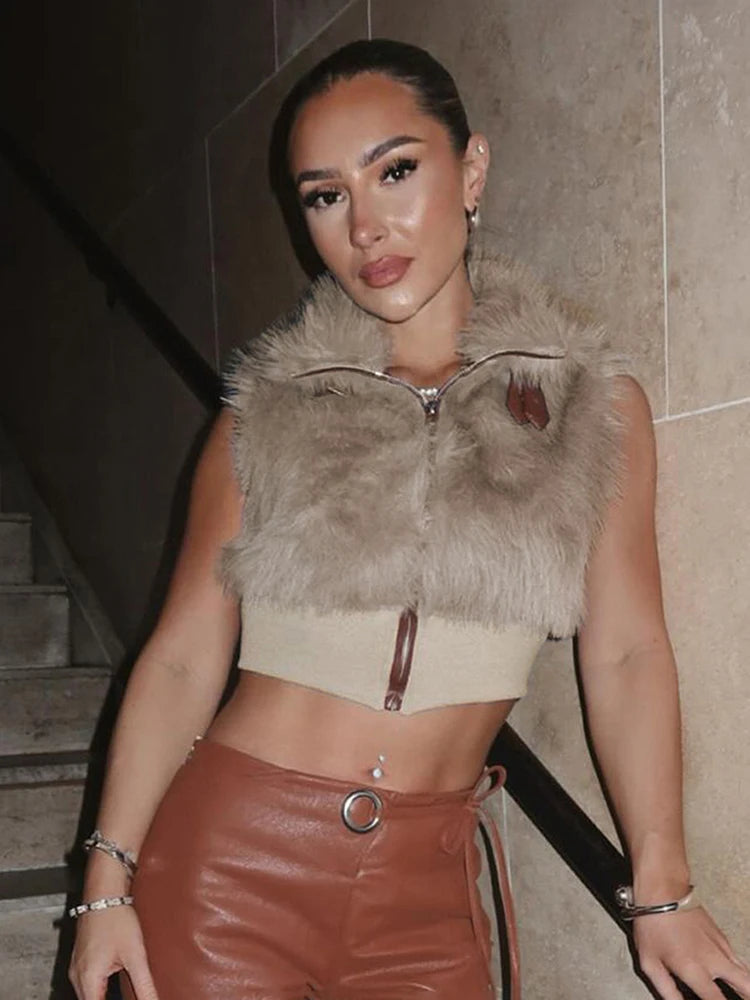 Sexy Furry Tank Tops Women Autumn Trend Patchwork Zip Metal Leather Buckle Slim Hottie Wild Street Clubwear Waistcoat