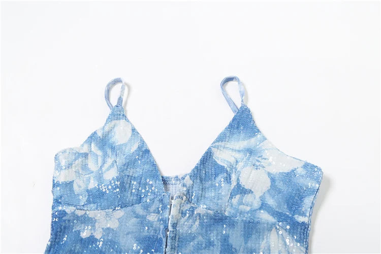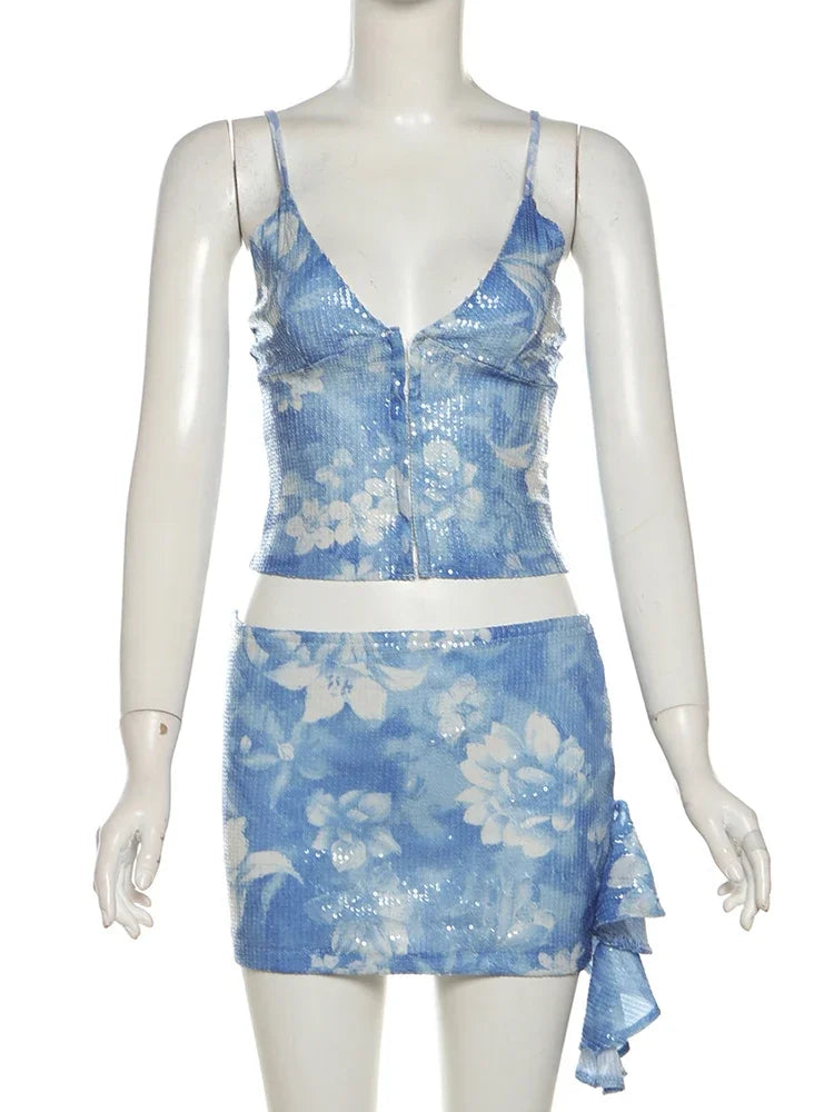 Sexy Glitter 2 Piece Set Women Y2K Sequins Halter V-Neck Backless Tops+Side Tassel Skirts Beach Party Matching Suits