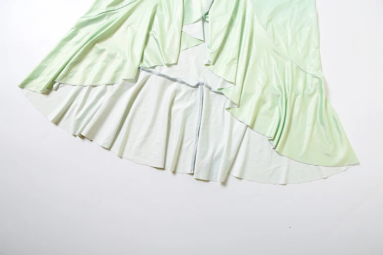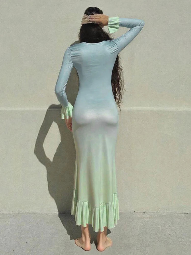 Sexy Gradient Dress Women Y2K Elegant Folds Split Ruffles Full Sleeve Low-Neck Party Banquet Stretch Skinny Vestidos