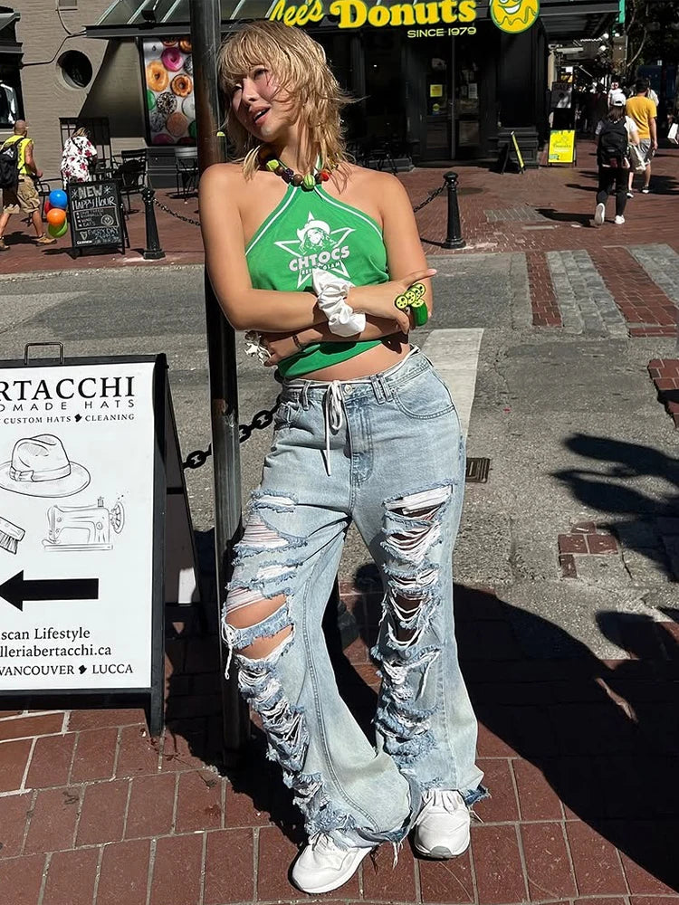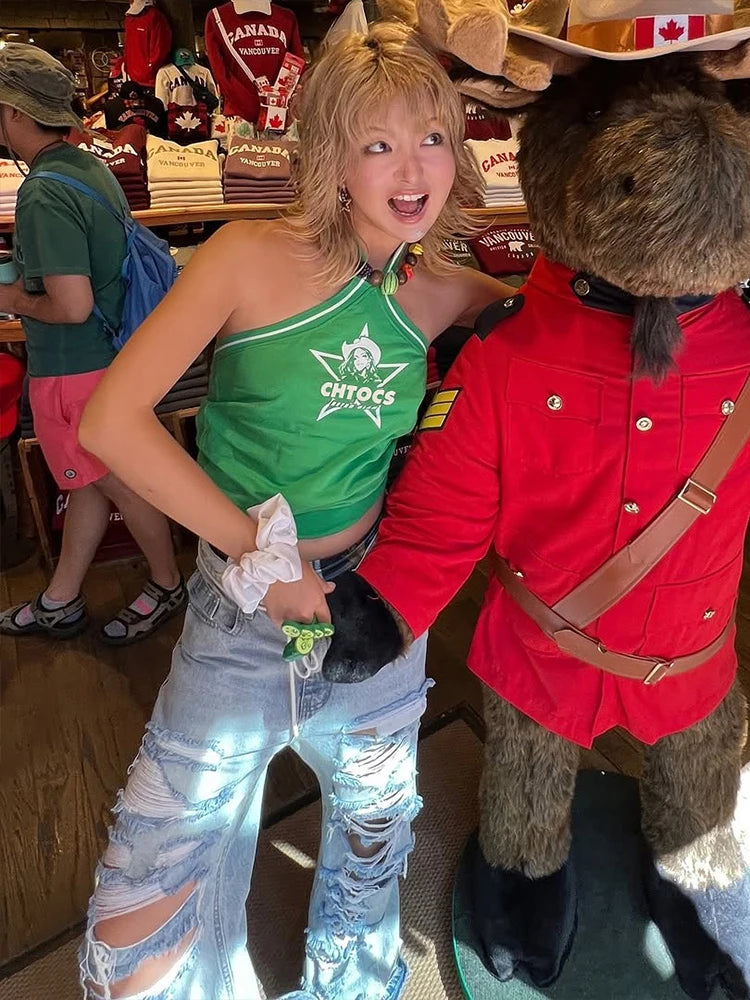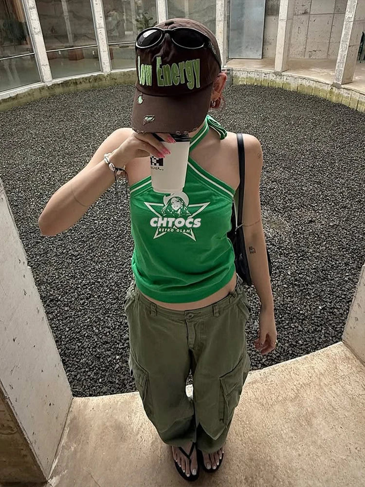 Sexy Halter Camisole Women Letter Star Print Lace-Up Backless Simple Wild Hottie Music Festival Slim Street Clubwear
