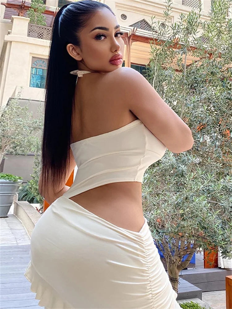 Sexy Hollow Waistless Dress Women Halter Turtleneck Backless Sleeveless Ruffles Tassel Hottie Hipster Mini Bodycon