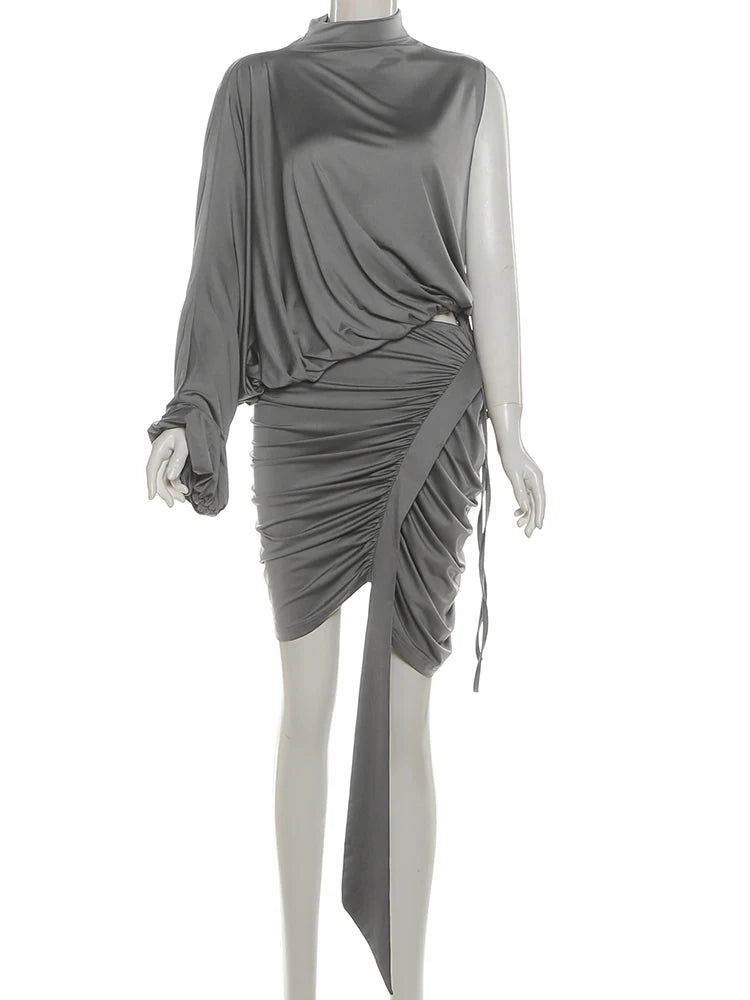 Sexy Irregular 2-Piece Set Women One shoulder Top+Shirring Ruched Peach Hip Skirt Matching Streetwear Elegant Outfits