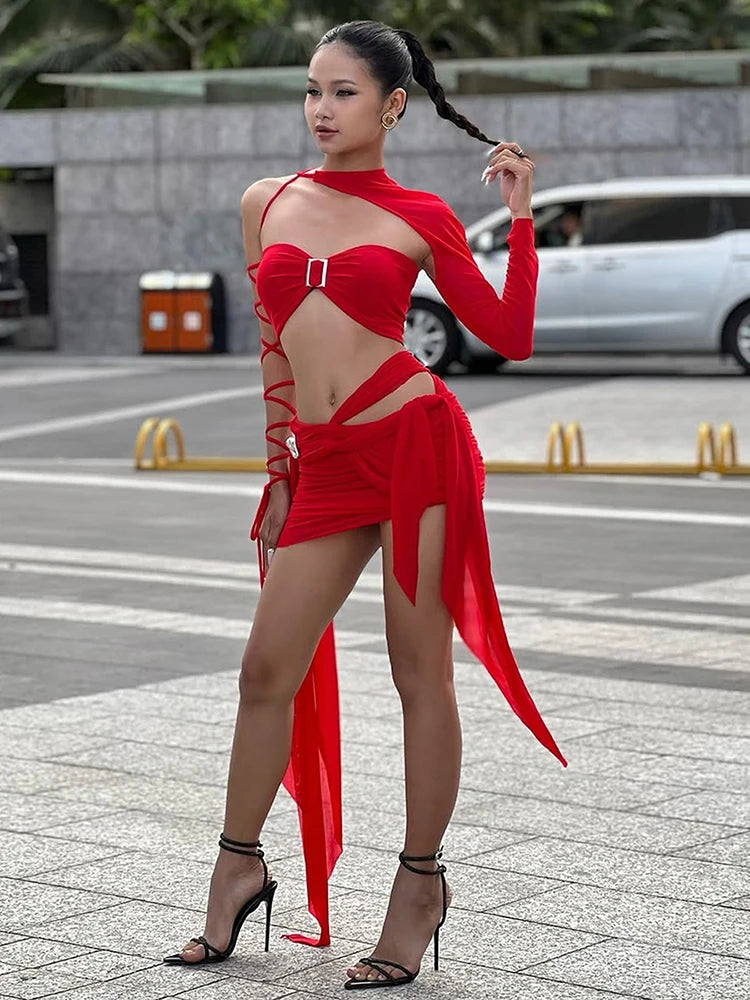 Sexy Irregular Bandage 3-Piece Set Women Chest Wrapped+Chic Sleeve+Lace-Up Skirt Matching Hottie Christmas Outfits