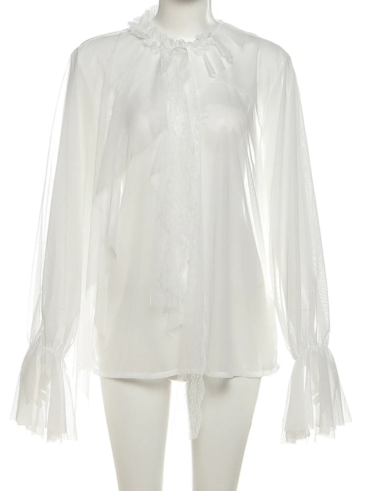 Sexy Mesh Coquette Top Women Lace Ribbon Backless Button Ruffles Pure Desire Wild Solid Street Midnight Clubwear Tees