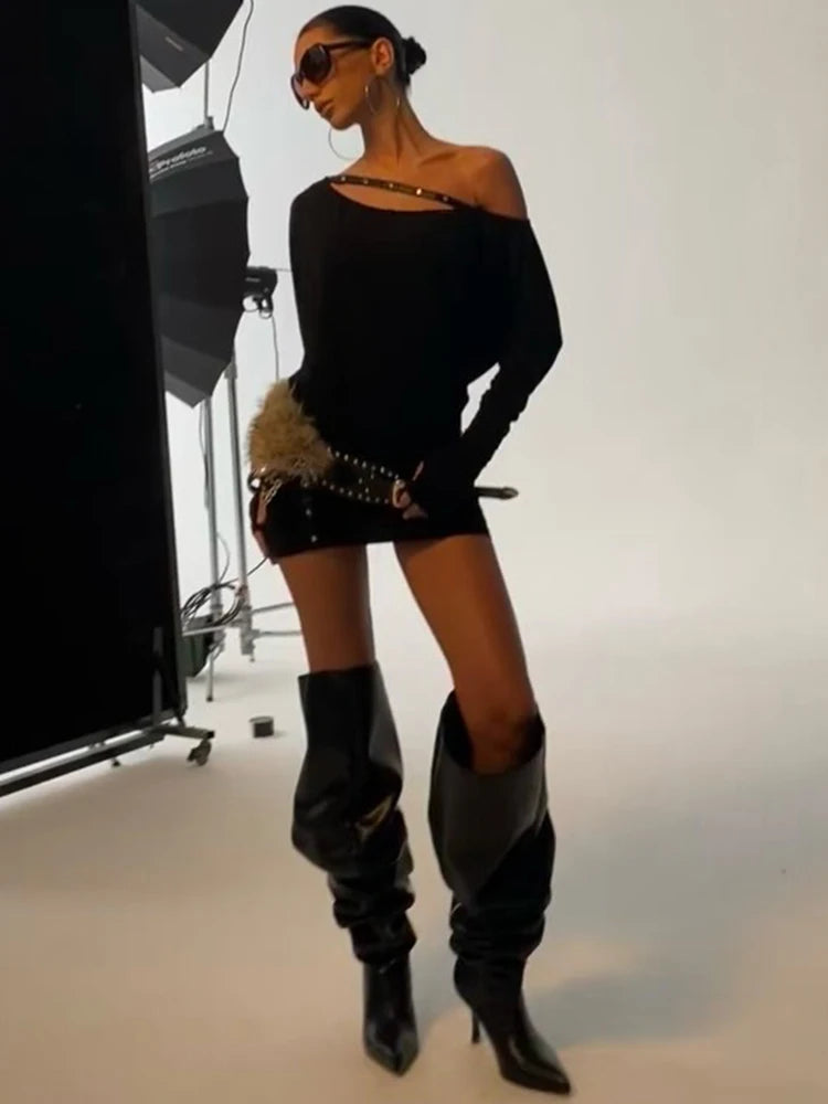 Sexy Slanted Shoulder Dress Women Ruched Batwing Full Sleeve Stretch Skinny Peach Hip Street Clubwear Mini Bodycon