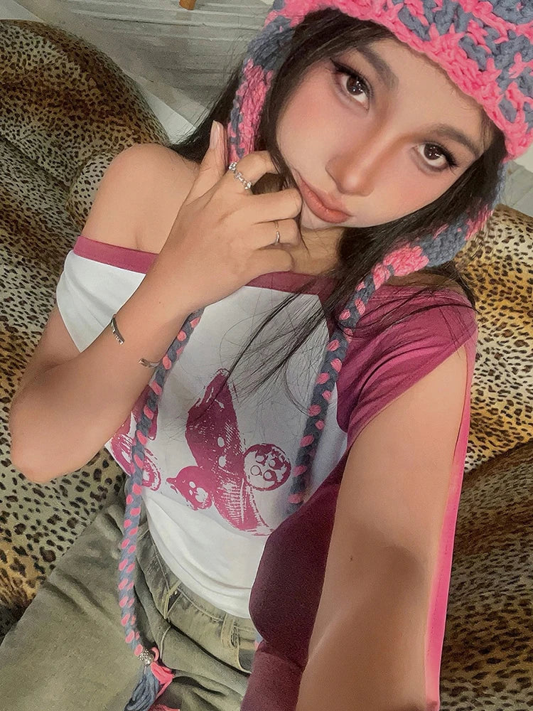 Sexy Slash Neck Crop Top Women Wild Y2K Irregular Patchwork Print Short Sleeve Music Festival Simple Clubwear T-Shirt