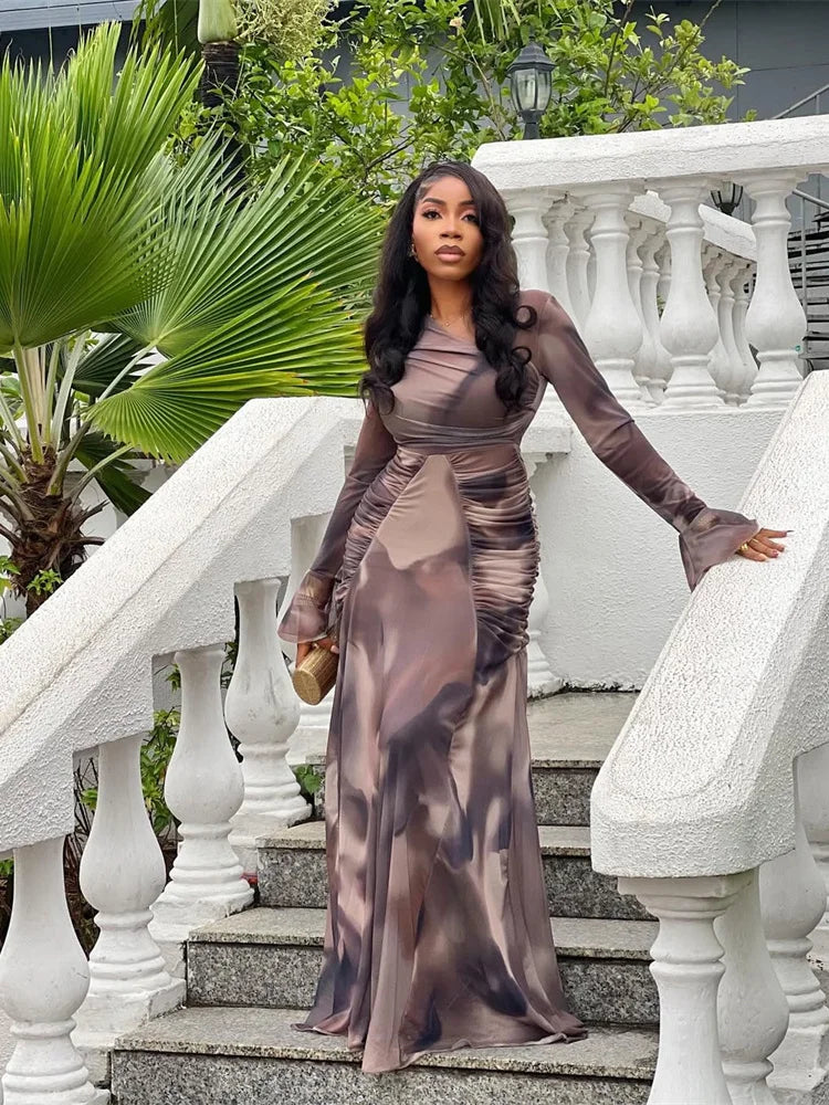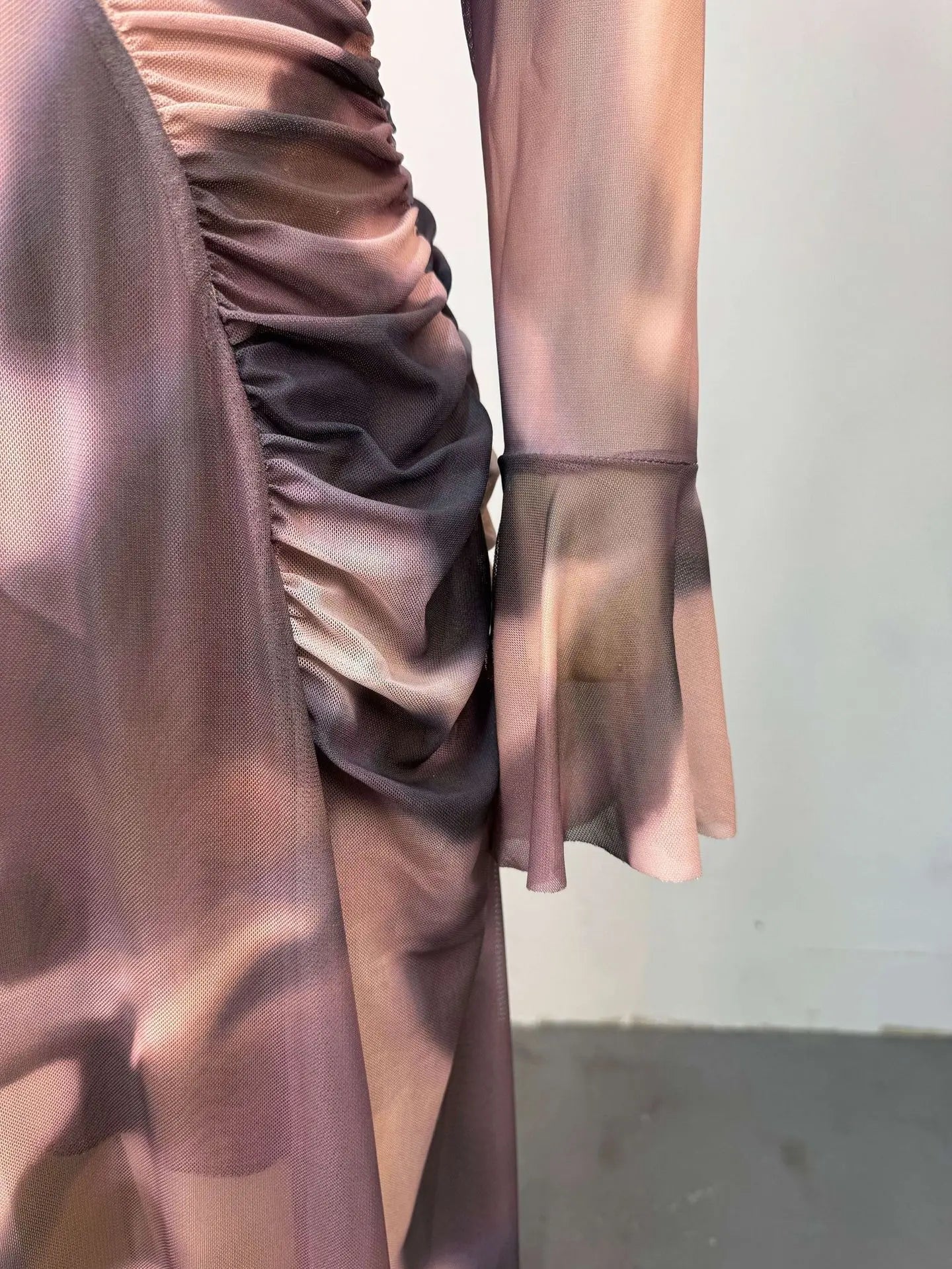 Sexy Tie Dye Dress Women Patchwork Mesh Ruched Flared Long Sleeve Stretch Tight Midnight Party Street Long Bodycon