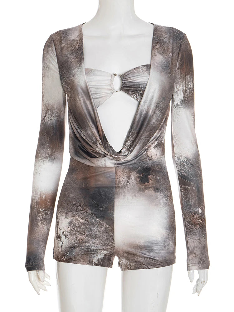 Sexy Tie-Dye Print Women Fake 2-piece Swing Neck Playsuit Ring Buckle Chest Wrap Matching Hipster Streetwear Outfits