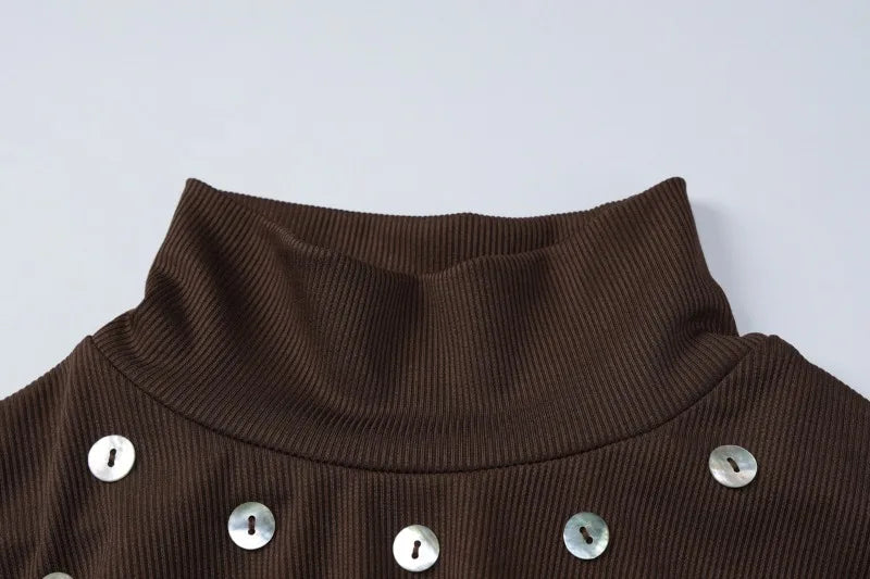 Shell Buckle Turtleneck Long Sleeve Top Brown Knit Tight Fitted T Shirts Fashion 2025 Autumn Clothes for Woman