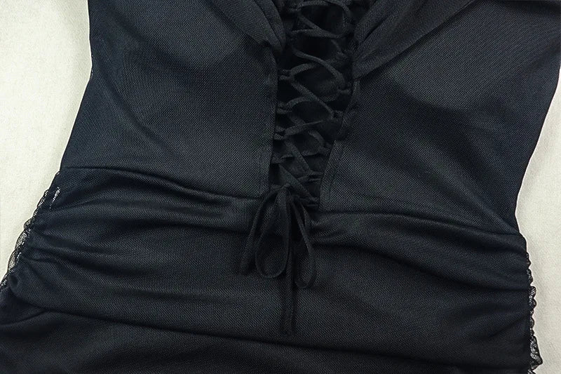 Shirring Dress Women Cross Slash Neck Elegant Patchwork Mesh Folds Stretchy Birthday Prom Evening Party Slim Vestidos