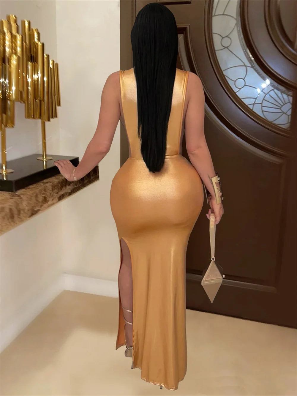 Silky Sexy Dress Women Sleeveless Waistless Metal Button Ribbon Ruched Side Split Party Midnight Club Wedding Bodycon