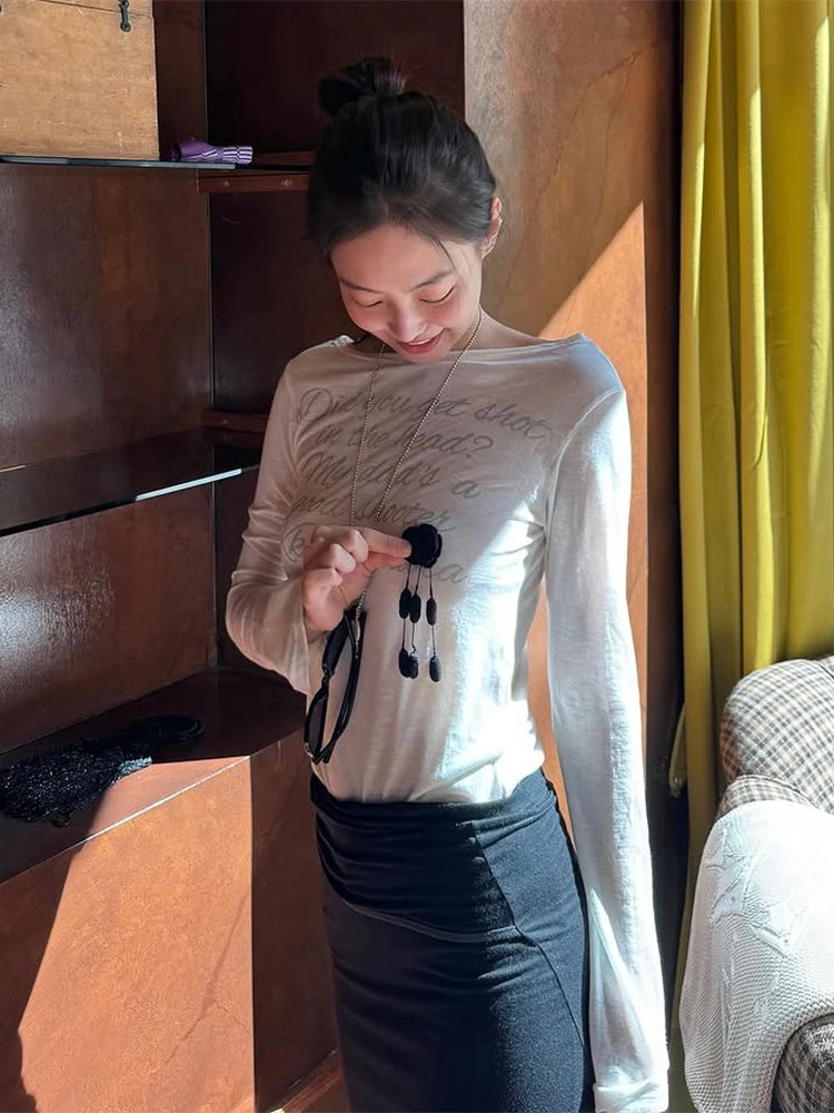 Simple T-Shirts Women Basic See Through Letter Print Long Sleeve Neck Skinny Autumn Trend Street Classic Casual Tees