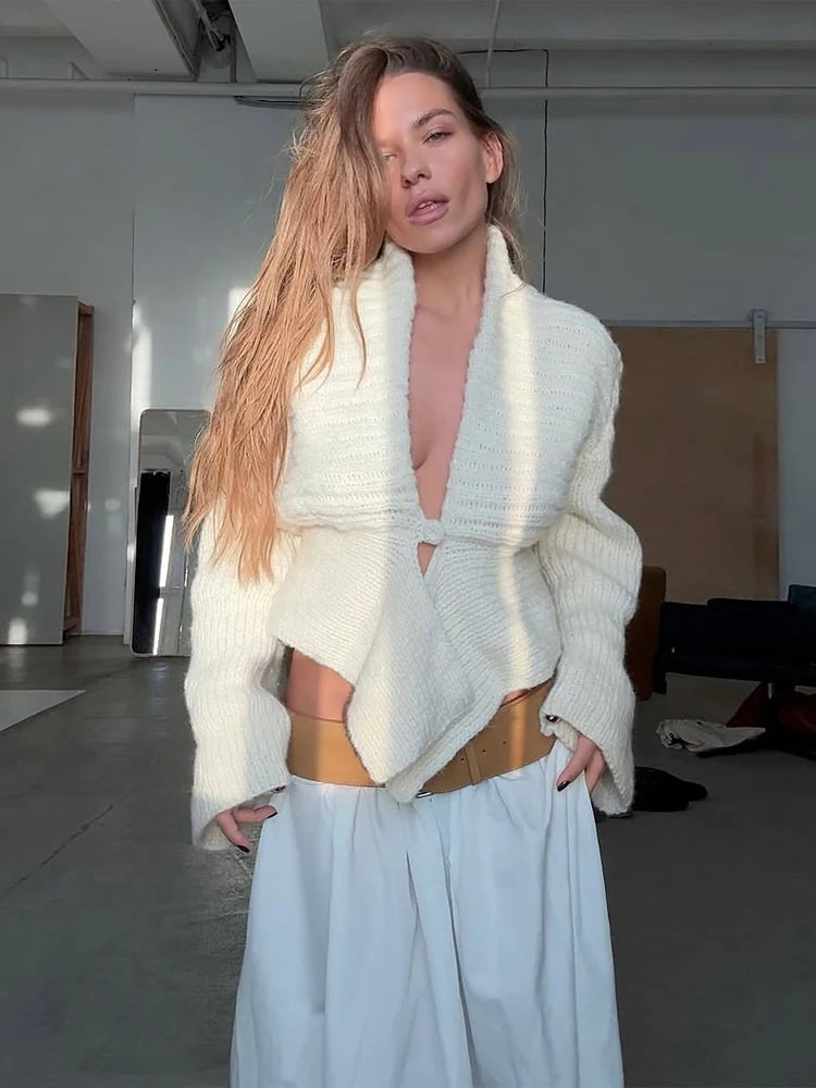 Single Button Cardigan Sweater Woman Elegant Deep V-Neck Full Sleeve Irregular Office Simple Streetwear Jackets Coat