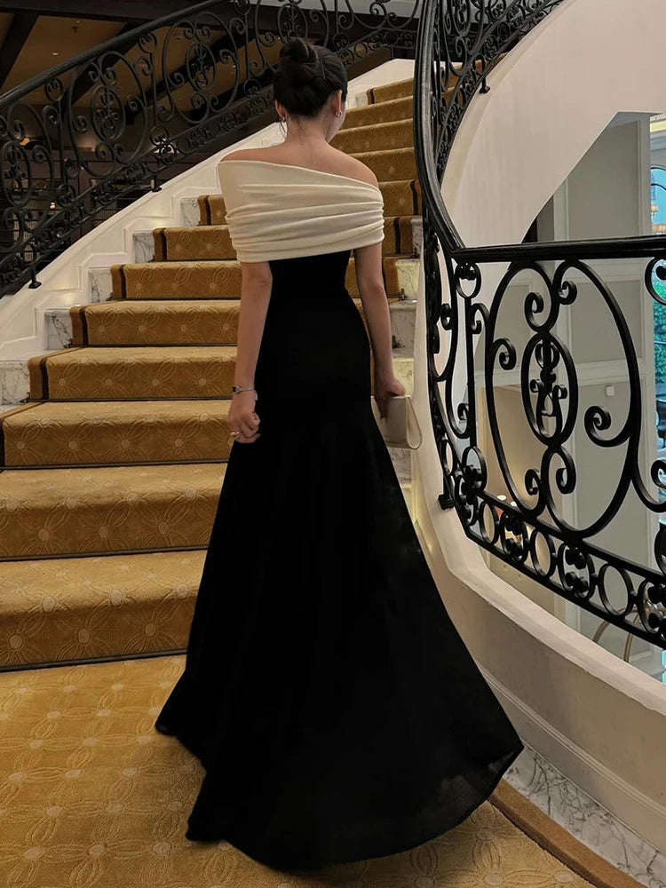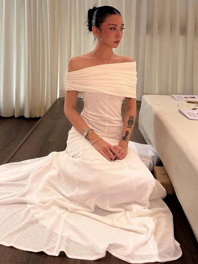 Slanted Collar Dress Women Classic Patchwork Elegant Ruched Skinny Chic Summer Birthday Party Banquet Simple Vestidos