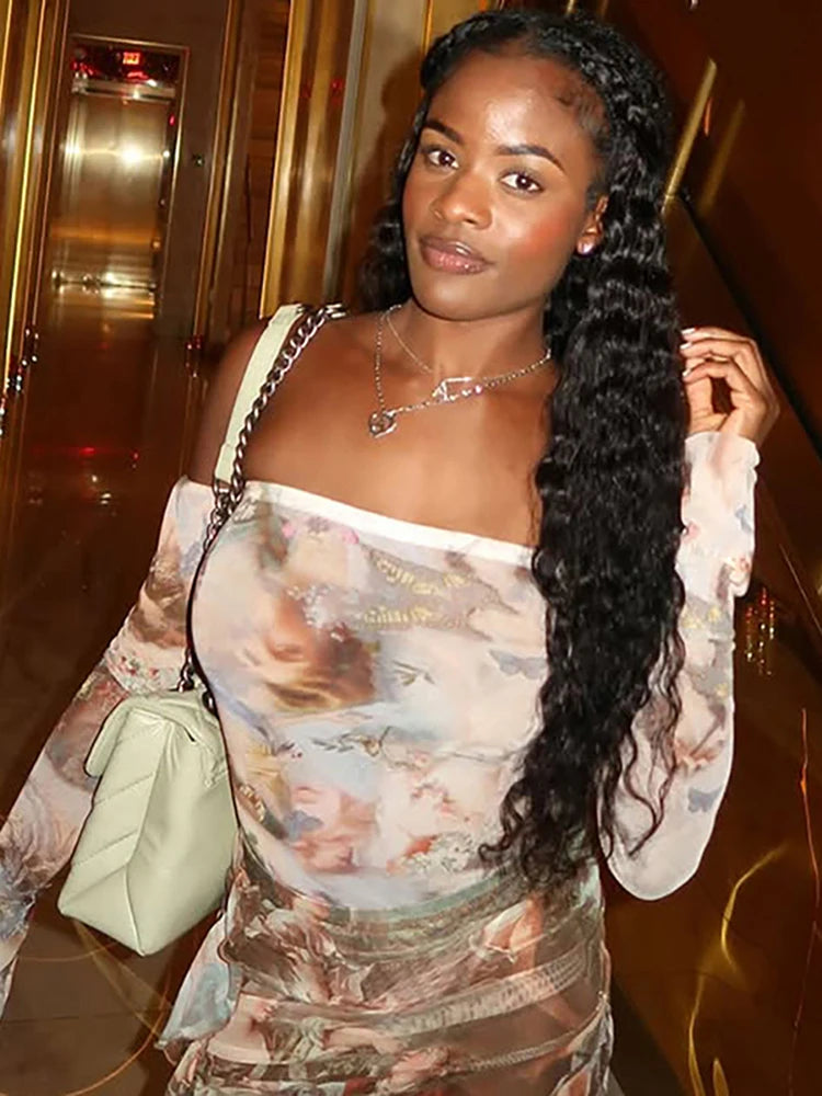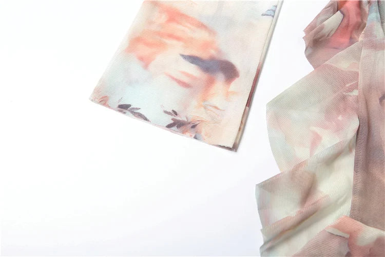 Slash Neck Dress Women See Through Full Sleeve Tie-Dye Print Coquette Autumn Trend Skinny Midnight Club Party Bodycon